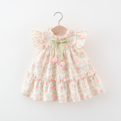 فستان بطبعة أرنب كرتوني للفتيات ، أكمام طائرة صغيرة ، زهرة ، شريط فيونكة للرقبة ، نمط زهرة التوليب ، ملابس صلبة ، الصيف