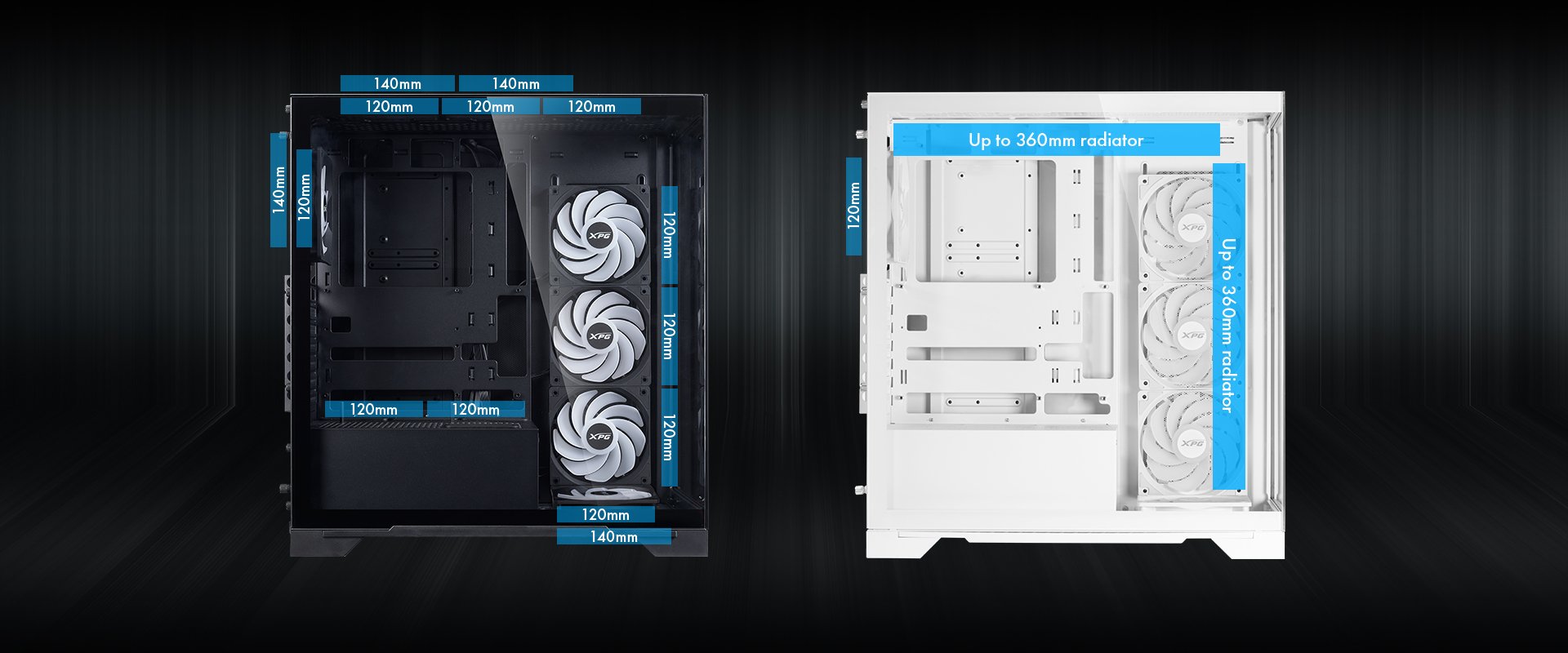 - يتغلب كيس XPG INVADER X BTF على الحرارة بفضل مساحته الواسعة، حيث يمكن استيعاب ما يصل إلى 10 مراوح لأداء تبريد فائق.