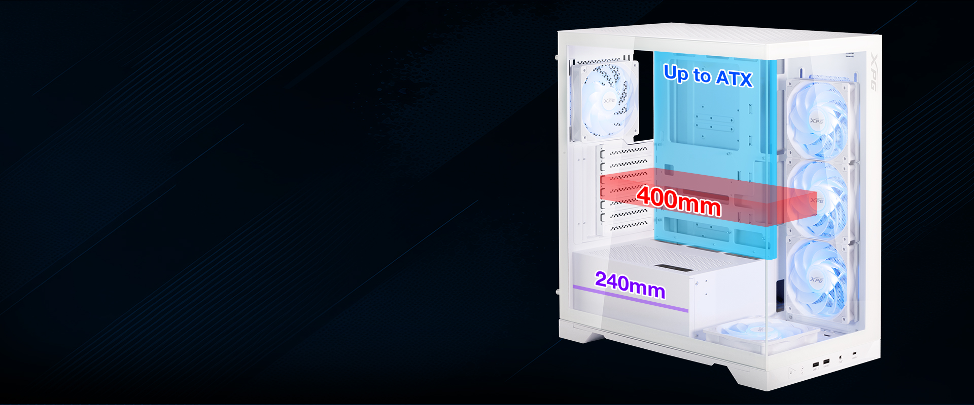 - يتميز كيس XPG INVADER X BTF بمرونة استثنائية عندما يتعلق الأمر بتحديد اللوحة الأم واختيار المكونات. تناسب مجموعة واسعة من أحجام اللوحات الأم، مدعمًا ATX وMicro-ATX، وحتى أحجام Mini-ITX المدمجة. بالإضافة إلى ذلك، يتسع لبطاقات الرسوميات بطول يصل إلى 400 مم، مما يوفر مساحة كافية حتى لأقوى بطاقات الرسوميات. علاوةً على ذلك، يوفر XPG INVADER X BTF مساحة كافية لوحدات الطاقة بطول يصل إلى 240 مم.
