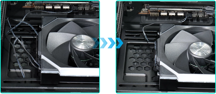 - قم بتشغيل كل مجموعة من المراوح عن طريق توصيل كبل PWM الموجود على جهاز الاستقبال باللوحة الأم (يتطلب إصدار LCD أيضًا اتصال USB منفصل لنقل الإشارة). يمكن تقصير طول الكبل عن طريق لفه حول المنظم الموجود على جهاز الاستقبال.