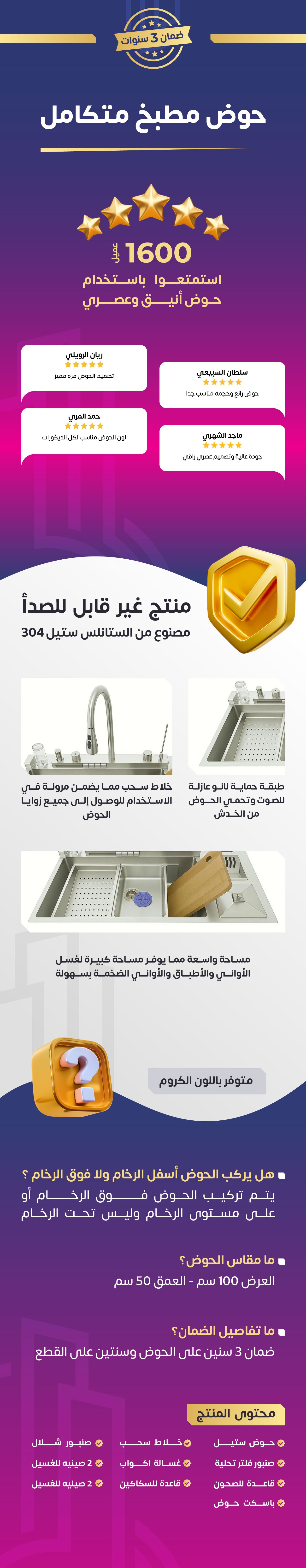 حوض مطبخ متكامل مع خلاط و باسكت حوض بمقاس كبير 100 * 50 سم