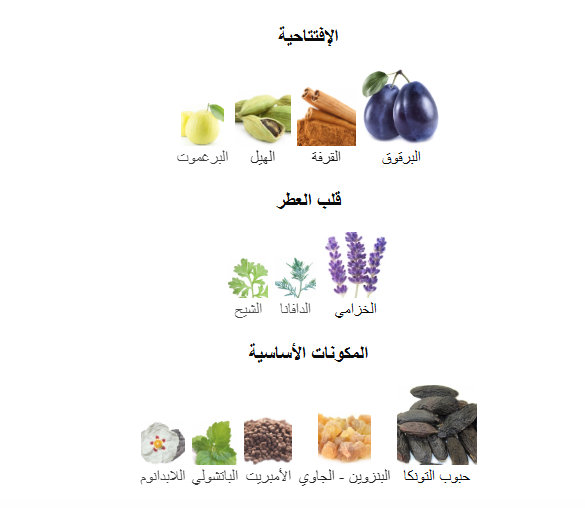 - القلب: عنبر، خزامى، قرفة، كومارين.