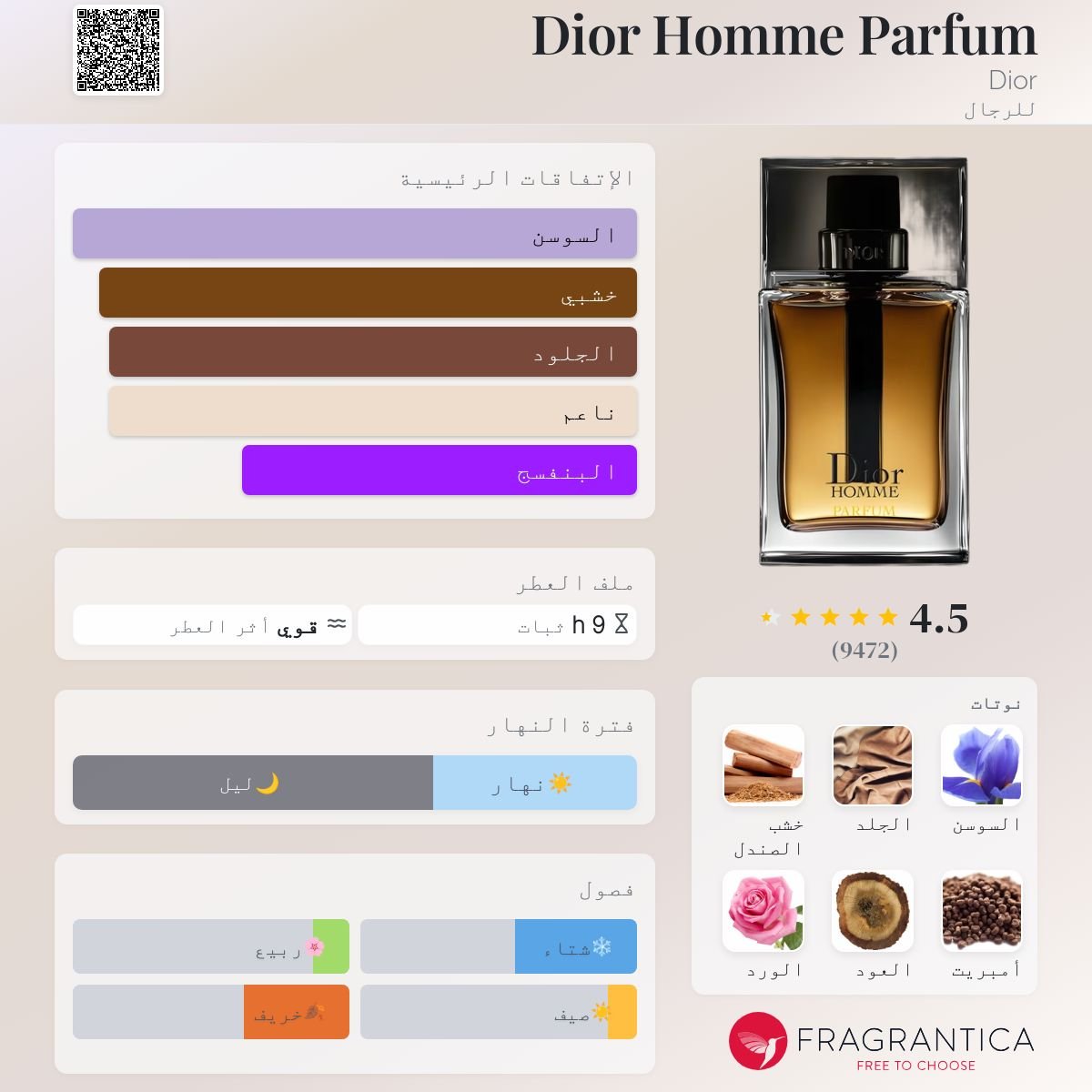 تم تصميم عطر ديور أووم الخشبي الزهري الرجالي من دار كريستيان ديور، وإصداره عام 2005، وهو العطر الأول من نوعه في استخدام السوسن كجزءٍ من تركيبته العطرة. تبرز النوتات العليا لهذا العطر الرجالي رائحة المريمية، والخُزامى، والبرغموت، وتتميز النوتات المتوسطة برائحة السوسن، والكاكاو، والهال، والعنبر. تظهر قاعدة العطر روائح نجيل الهند التاهيتي، والجلد، والبتشول، وهو ما يجعل هذا العطر المصمم على يد أوليفير بولج، عطراً أنيقاً، ومثيراً، ومميزاً؛ إنه خيار رائع لإتمام إطلالتك. عطر ديور أووم هو العطر المثالي لفصل الشتاء وللسهرات.
