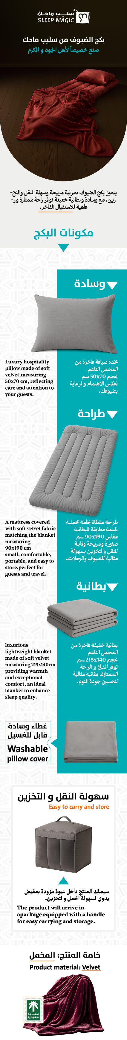 بكج الضيوف المتكامل من سليب ماجيك معك وين ما تروح بفضل تصميمه الذكي وخاماته الخفيفة يمكن نقله بسهولة وتخزينه في أي مساحة دون أن يفقد شكله أو جودته كما أنه يمنحك حلاً سريعاً لكل مناسبة ضيافة سواء في المنزل أو خارج المنزل ويتميز كل عنصر فيه بلمسة راقية تتكامل مع بعضها لتقديم أفضل تجربة نوم مؤقت