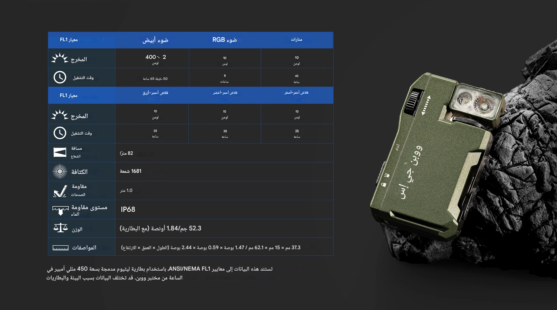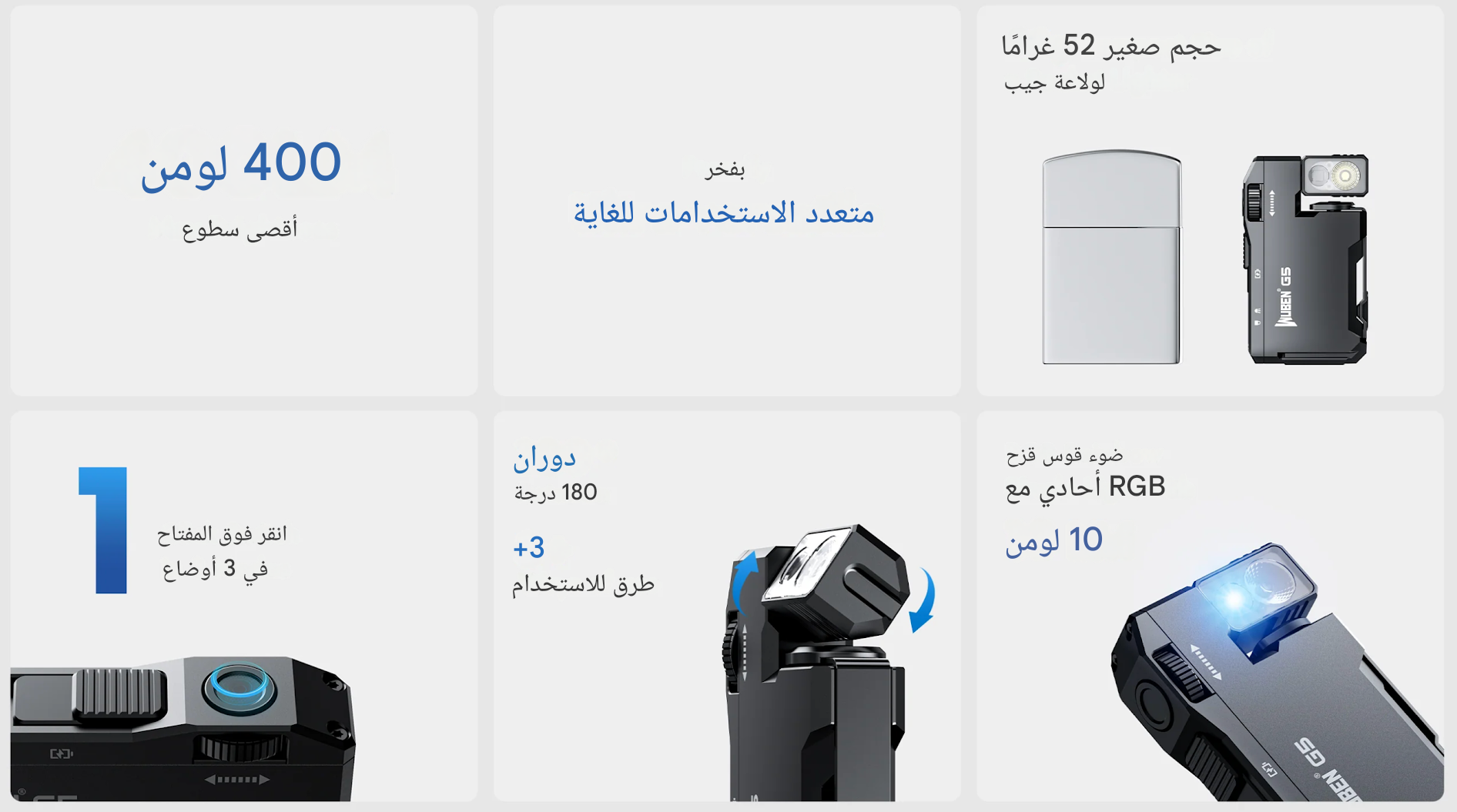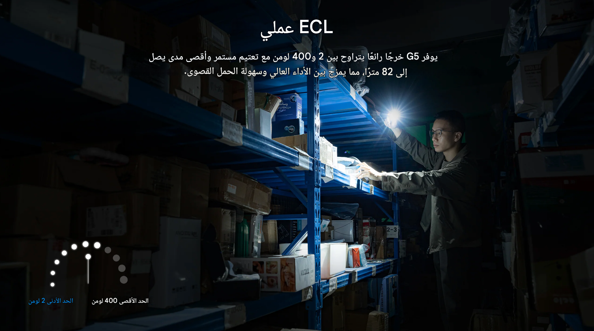 يقدّم الكشاف إضاءة تصل إلى 400 لومن بمدى إضاءة يبلغ 82 مترًا، مما يوفر رؤية واضحة في البيئات الداخلية والخارجية على حد سواء.