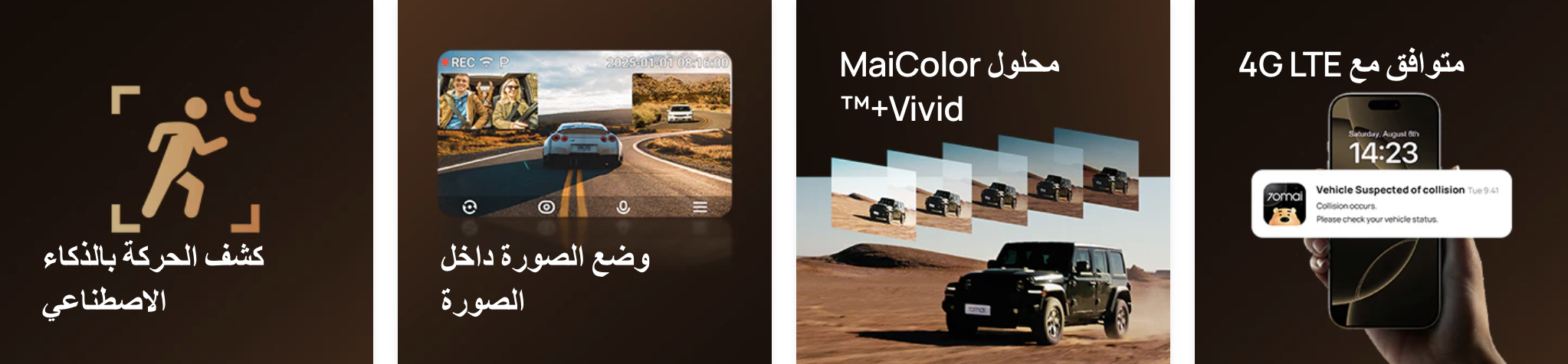 - نظام كشف الحركة بالذكاء الاصطناعي لرصد الحركة الغير طبيعية حول السيارة وتفعيل الكاميرات الثلاث مع تسجيل متزامن لمدة 30 ثانية لالتقاط كل الزوايا.