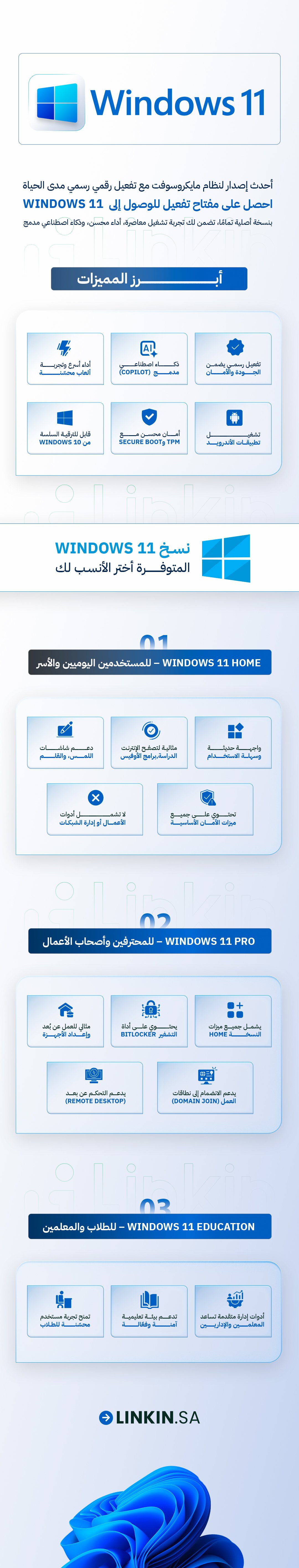 199 ر.سمفتاح Windows 11 — أحدث إصدار لنظام مايكروسوفت، الآن عبر لينك إن Linkin.sa – تفعيل رقمي رسمي مدى الحياة.