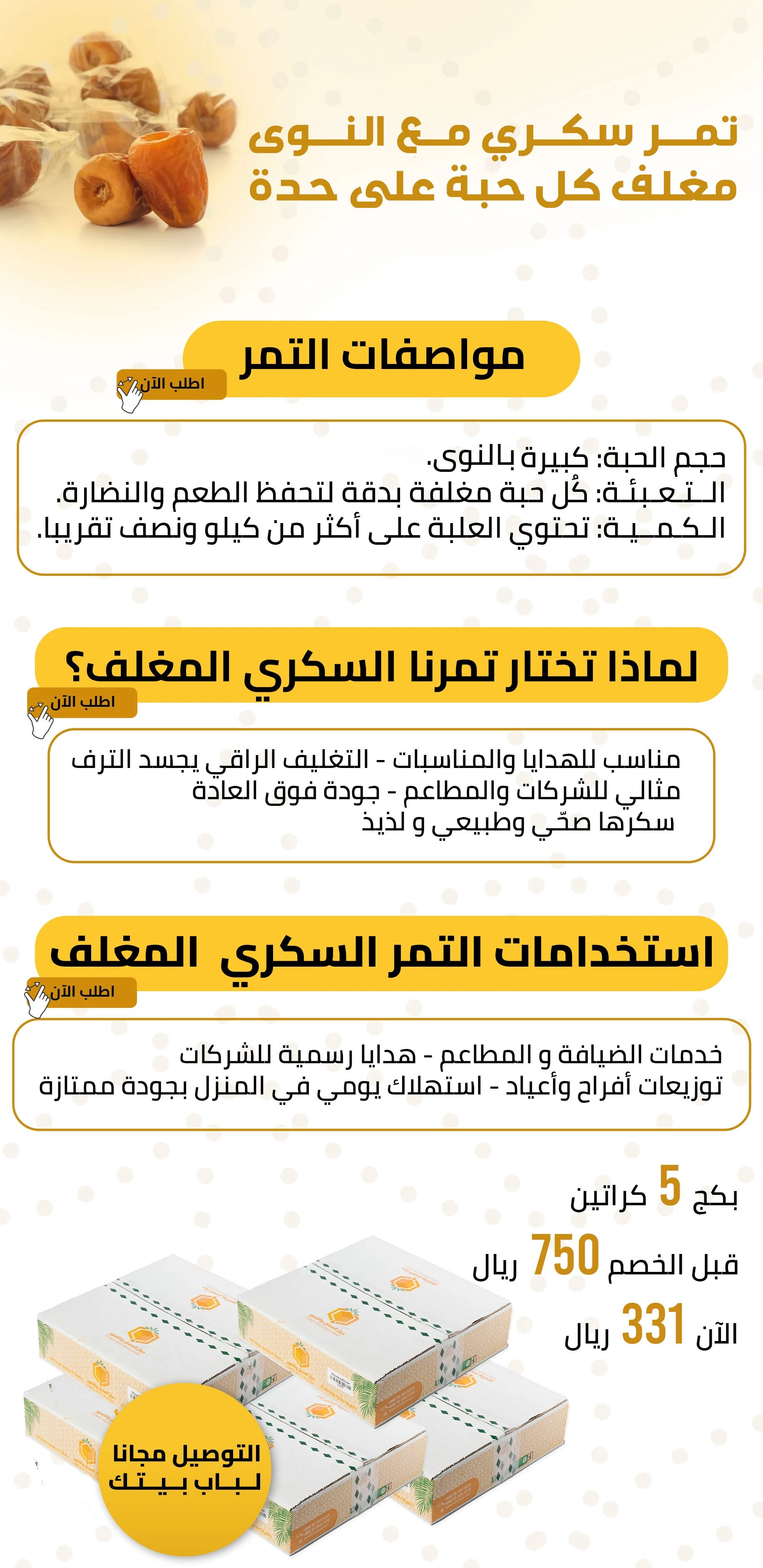 بكج خمس كراتين تمر سكري بالنوى مغلف فردي وزن 7.5 كيلو 331 ريال ( كمية عائلية) مع توصيل مجاني