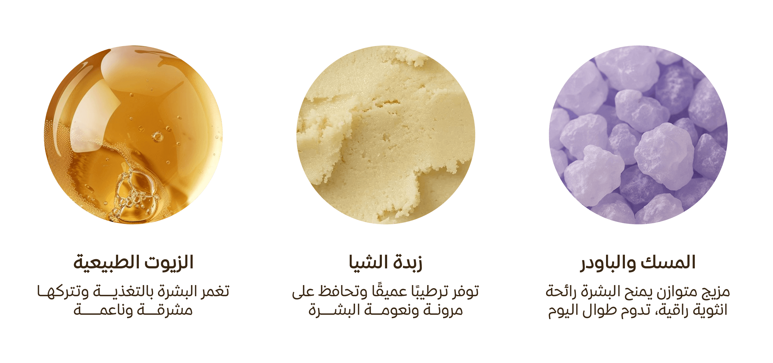 ترطيب عميق يدوم لمدة 24 ساعة. يحتوي على مزيج فريد من المسك والباودر لإضافة رائحة جذابة. تركيبته خفيفة تُمتص بسرعة دون ترك أي أثر دهني. يزيد من نعومة البشرة ويمنحها ملمساً حريرياً. مناسب لجميع أنواع البشرة، بما في ذلك الحساسة.