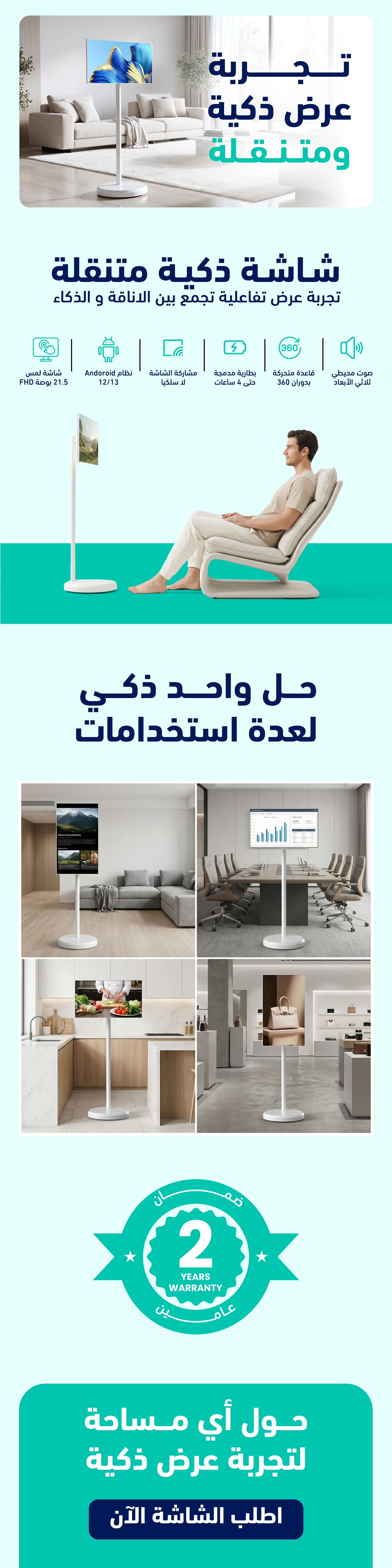 هذه شاشة متنقلة ذكية مصممة لتلائم الإعلانات داخل المتاجر، العروض التقديمية، الاجتماعات، التعليم، والمحتوى الترفيهي، مع حامل أرضي أنيق قابل للدوران وبطارية مدمجة تتيح لك استخدامها في أي مكان دون الحاجة إلى مصدر طاقة ثابت.