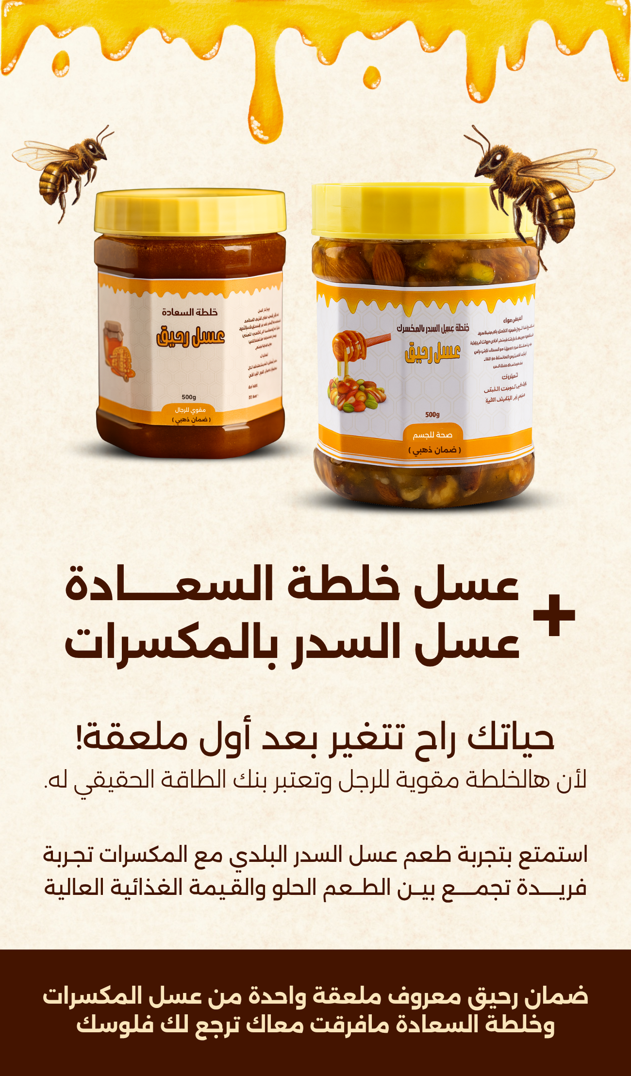 مكوناتها عسل السدر البلدي اجود أنواع المكسرات (اللوز-عين الجمل -الكاجو الفستق)