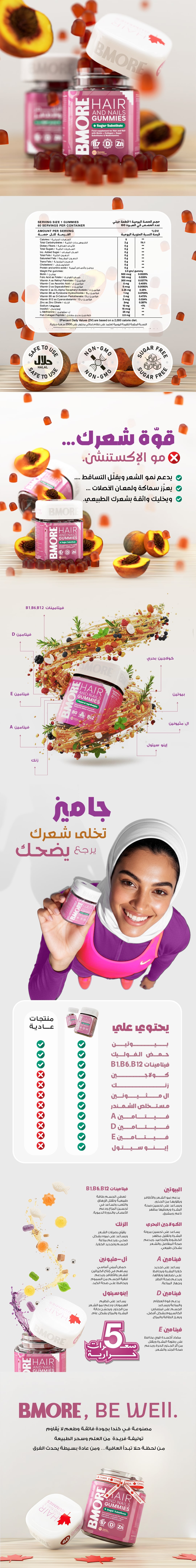 بي مور جاميز الشعر والأظافر - البيوتين 500 والكولاجين والزنك 60 قطعة بنكهة الخوخ من بي مور كندا