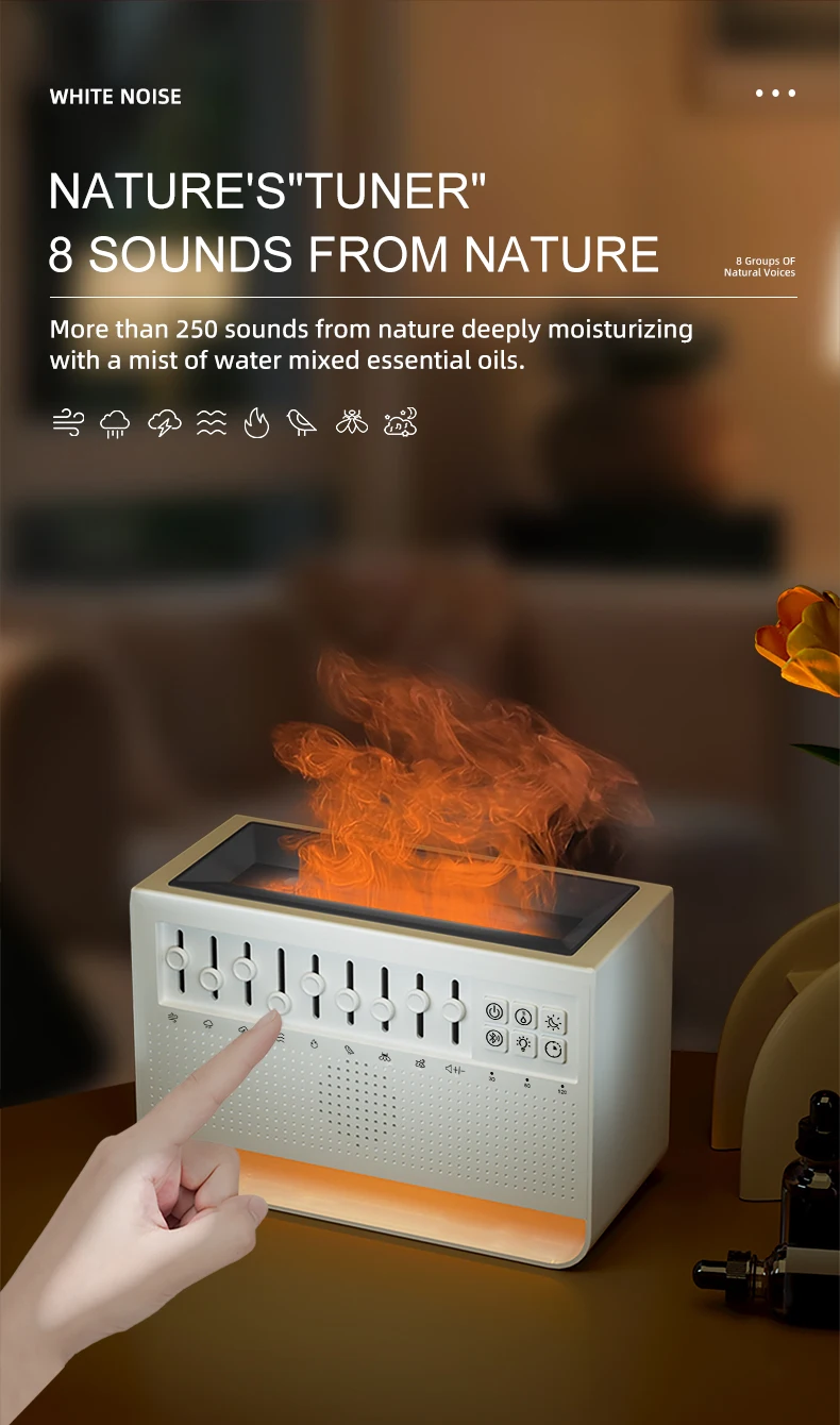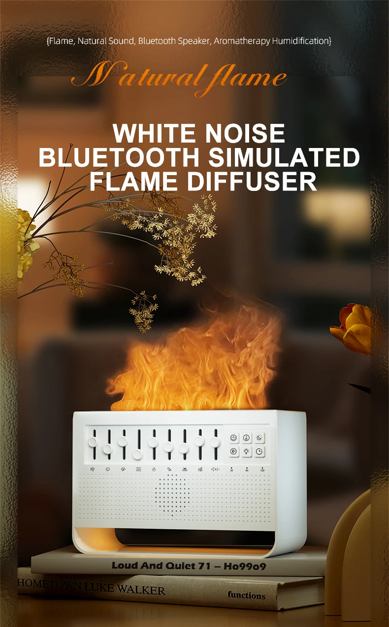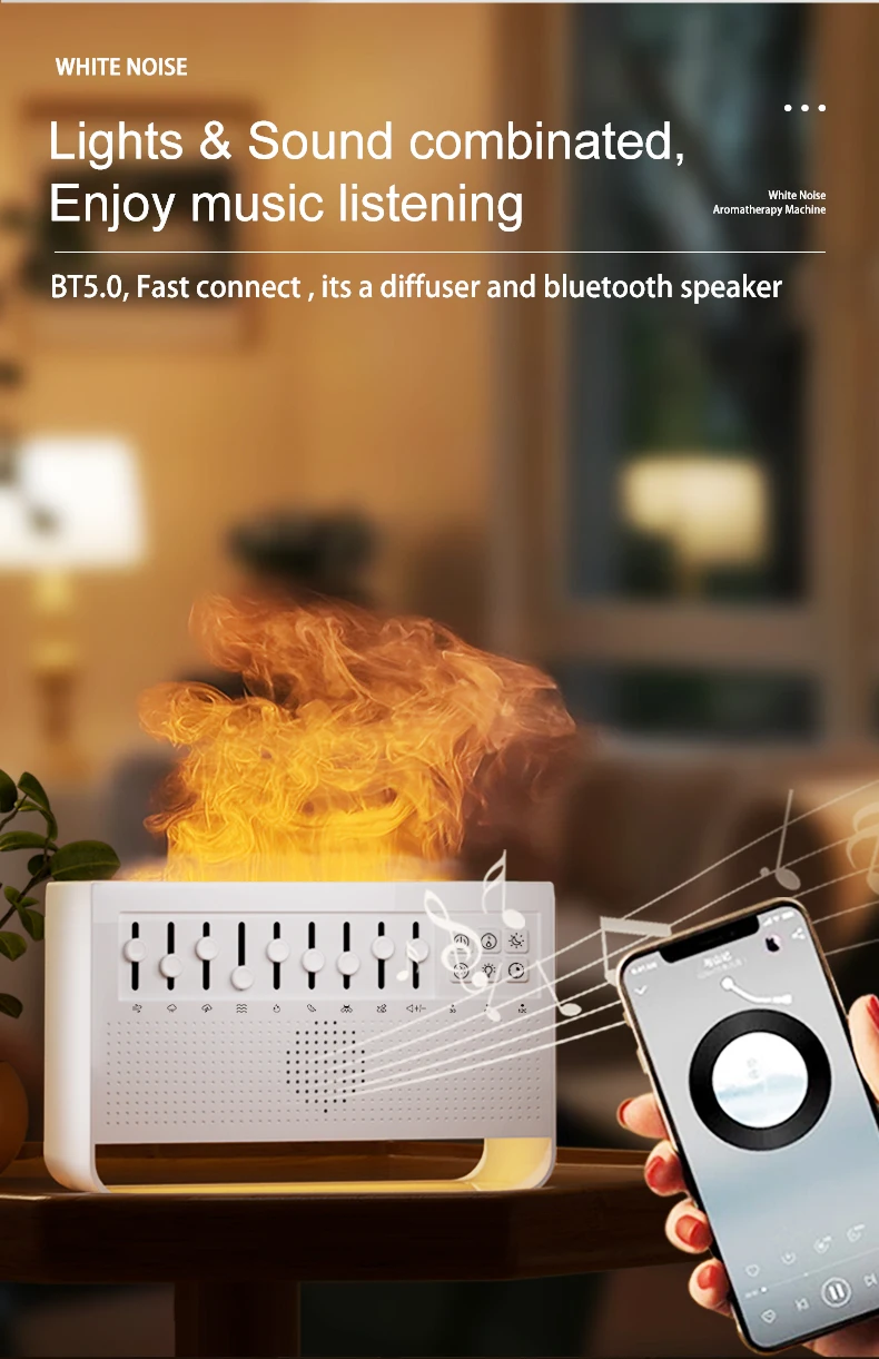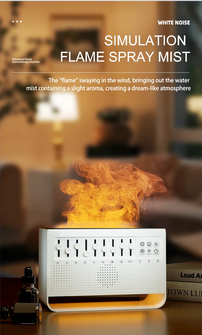3in1 لهب موزع الهواء المرطب بالموجات فوق الصوتية الروائح 8 مزيج الضوضاء البيضاء ومشغل موسيقى بلوتوث الناشر العطر