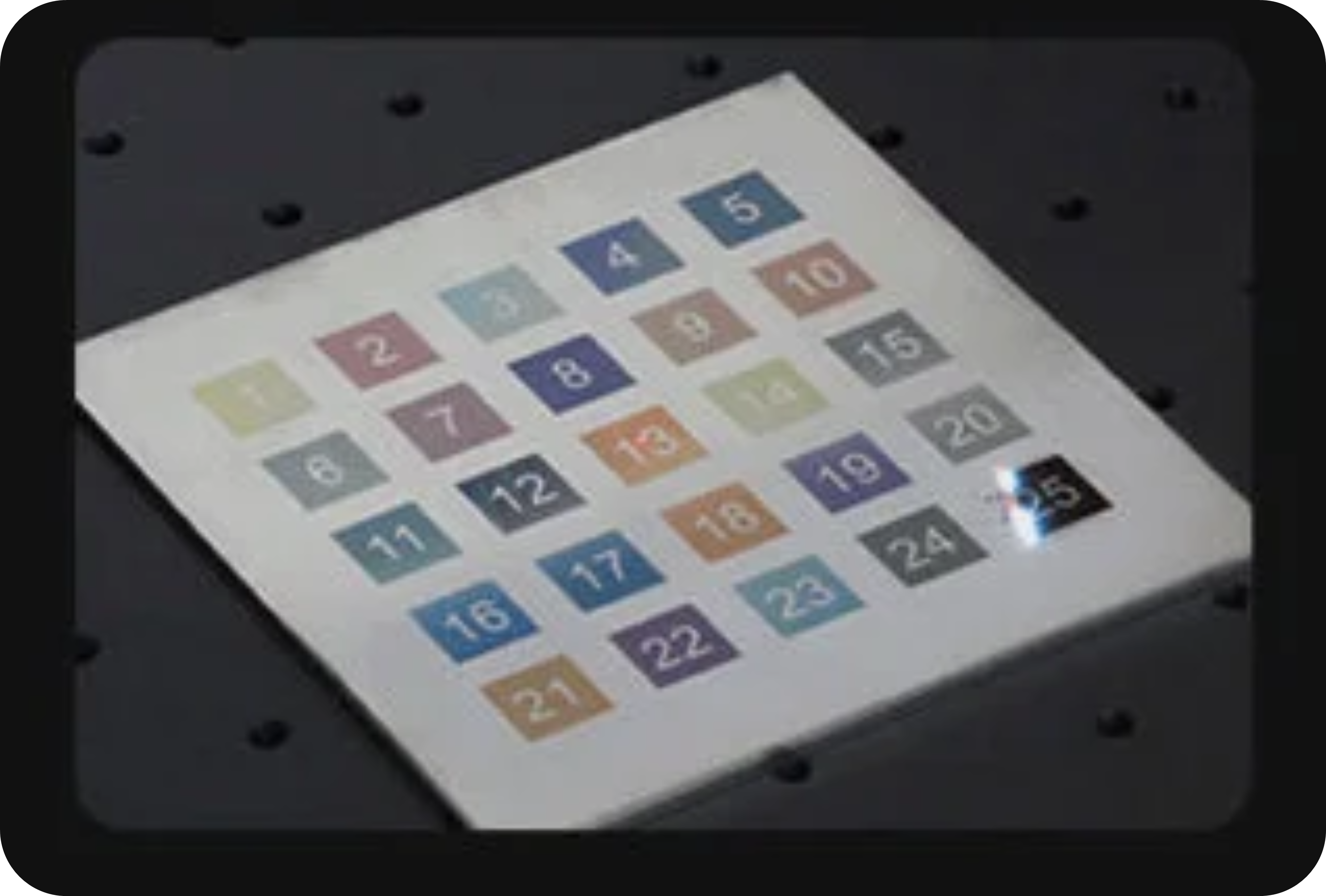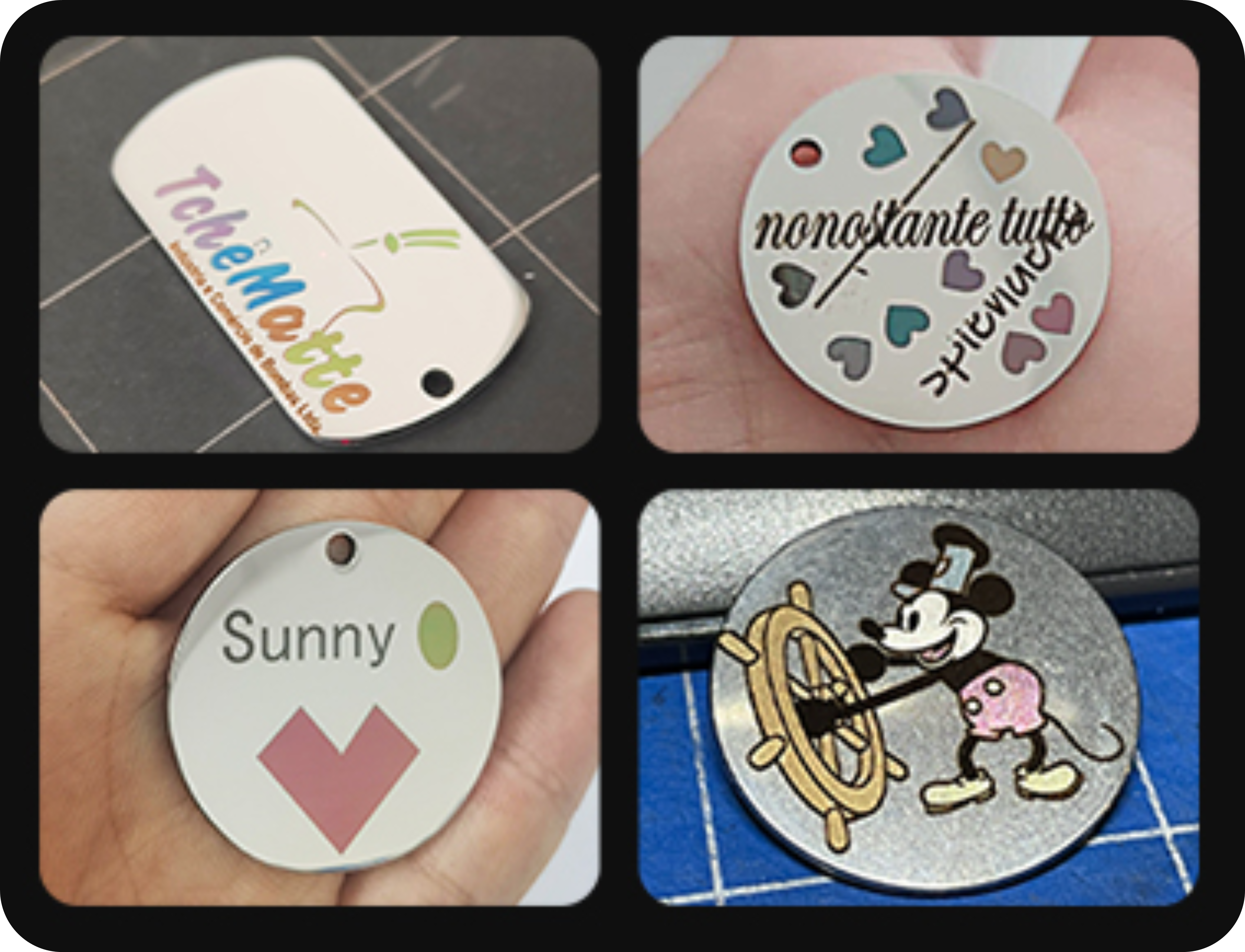 امكانية الحفر على معدن الاستان استيل مع امكانية التلوين الليزري وهذه صورة توضح بعض الالون بالليزر لمادة الاستان استيل فقط اما مادة الالمنيوم اسود وابيض فقط