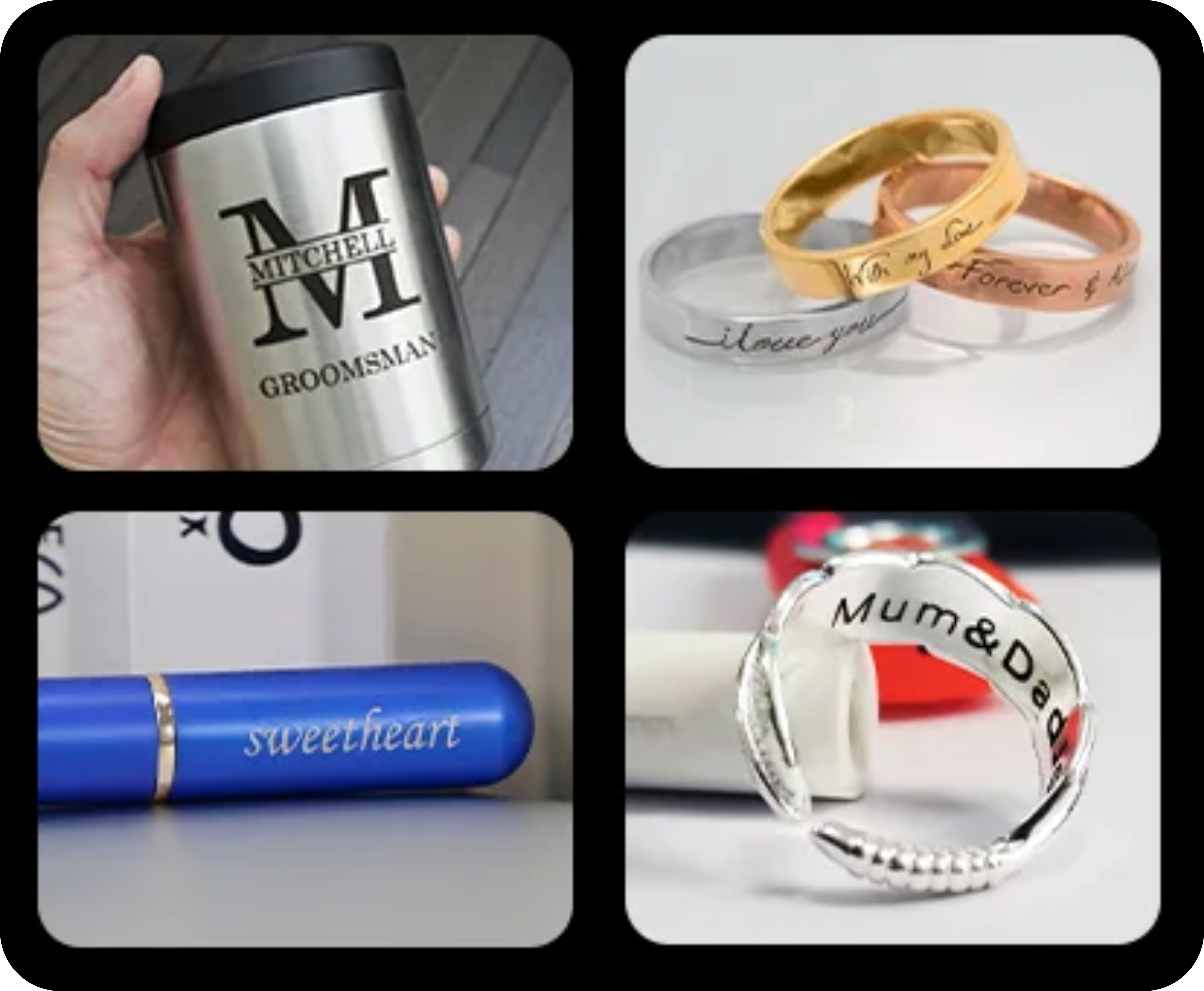 كذلك هنالك توجد امكانيات متنوعه حسب طلبكم ورغبتكم على سبيل المثال الحفر على الخواتم والاكواب المعدنية والاقلام