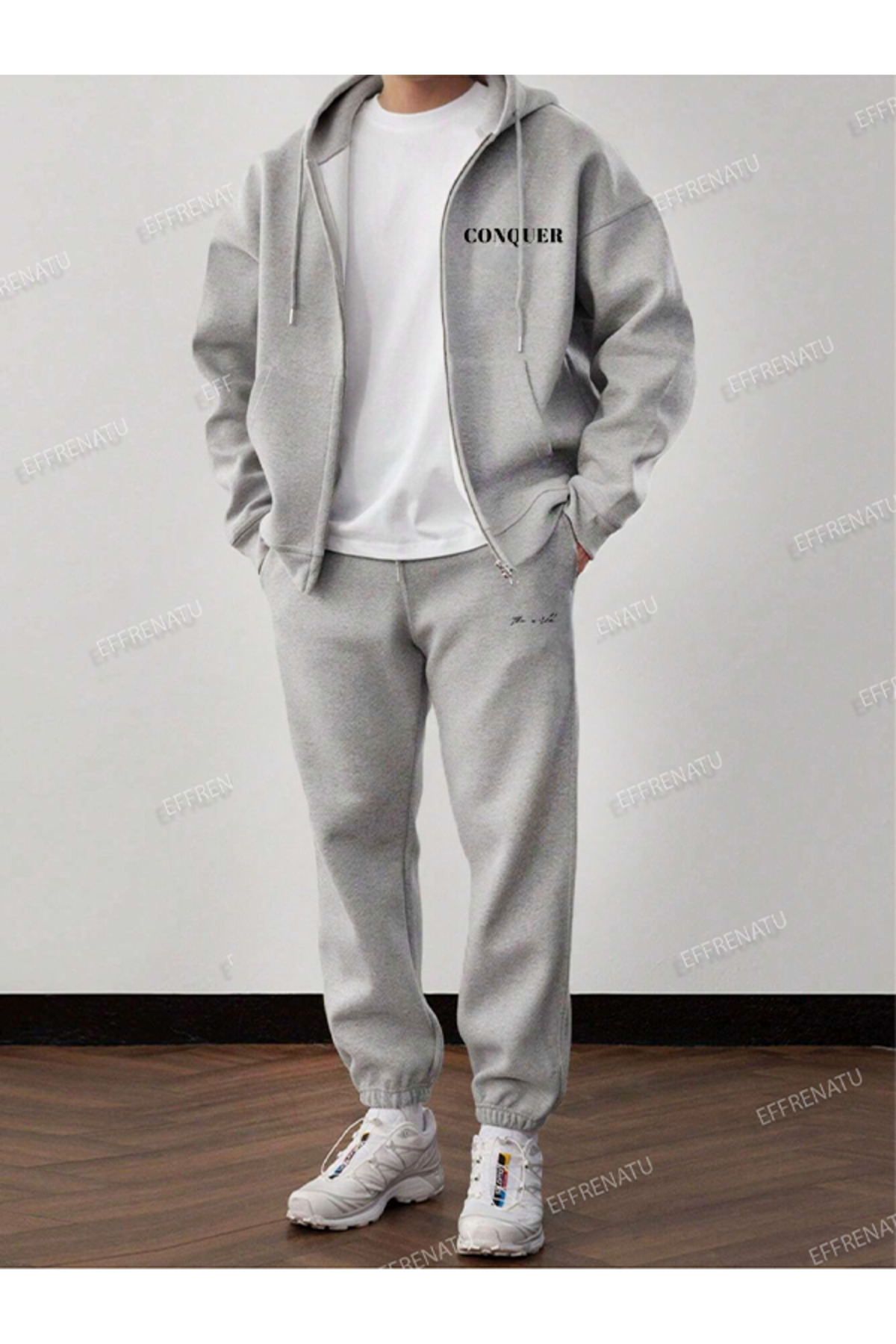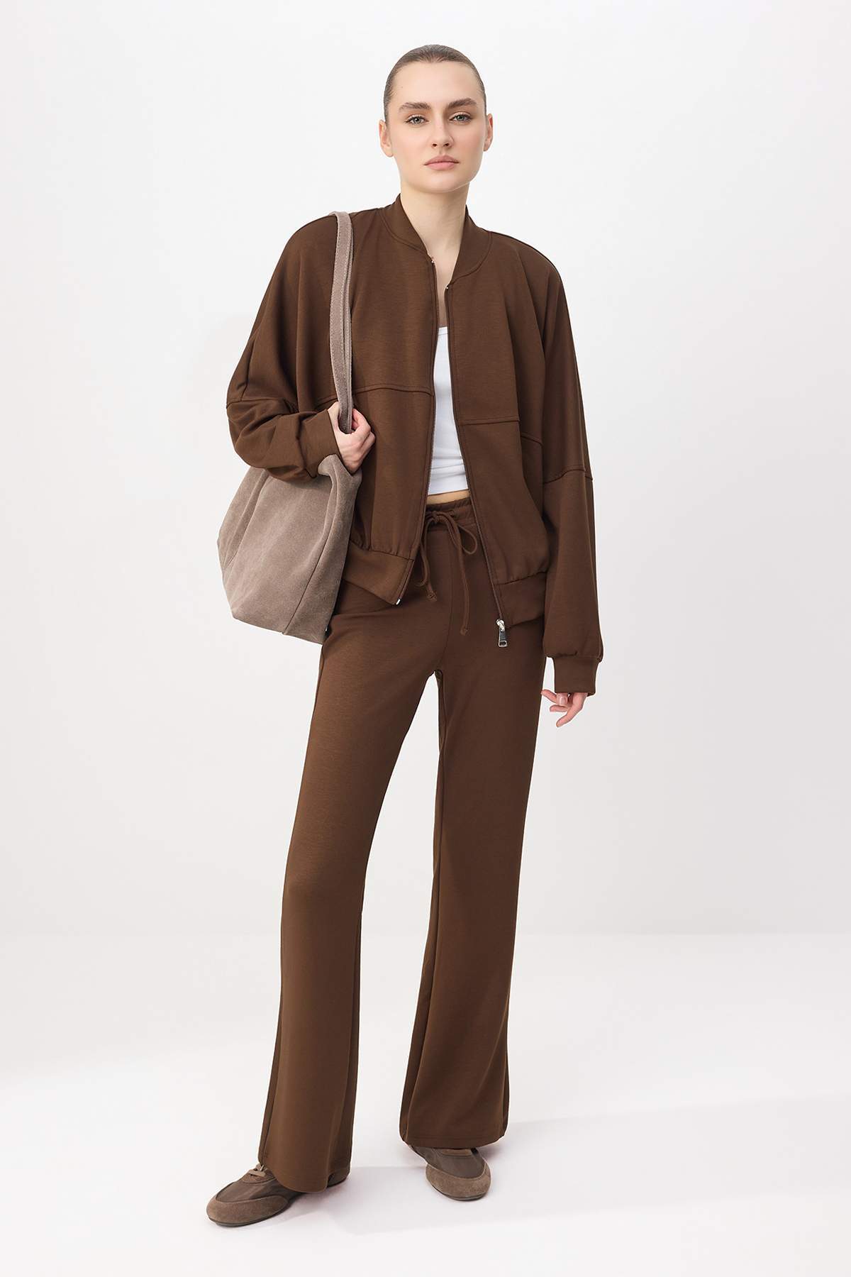 بدلة رياضية من القماش المشروط بأرجل واسعة مع سحاب