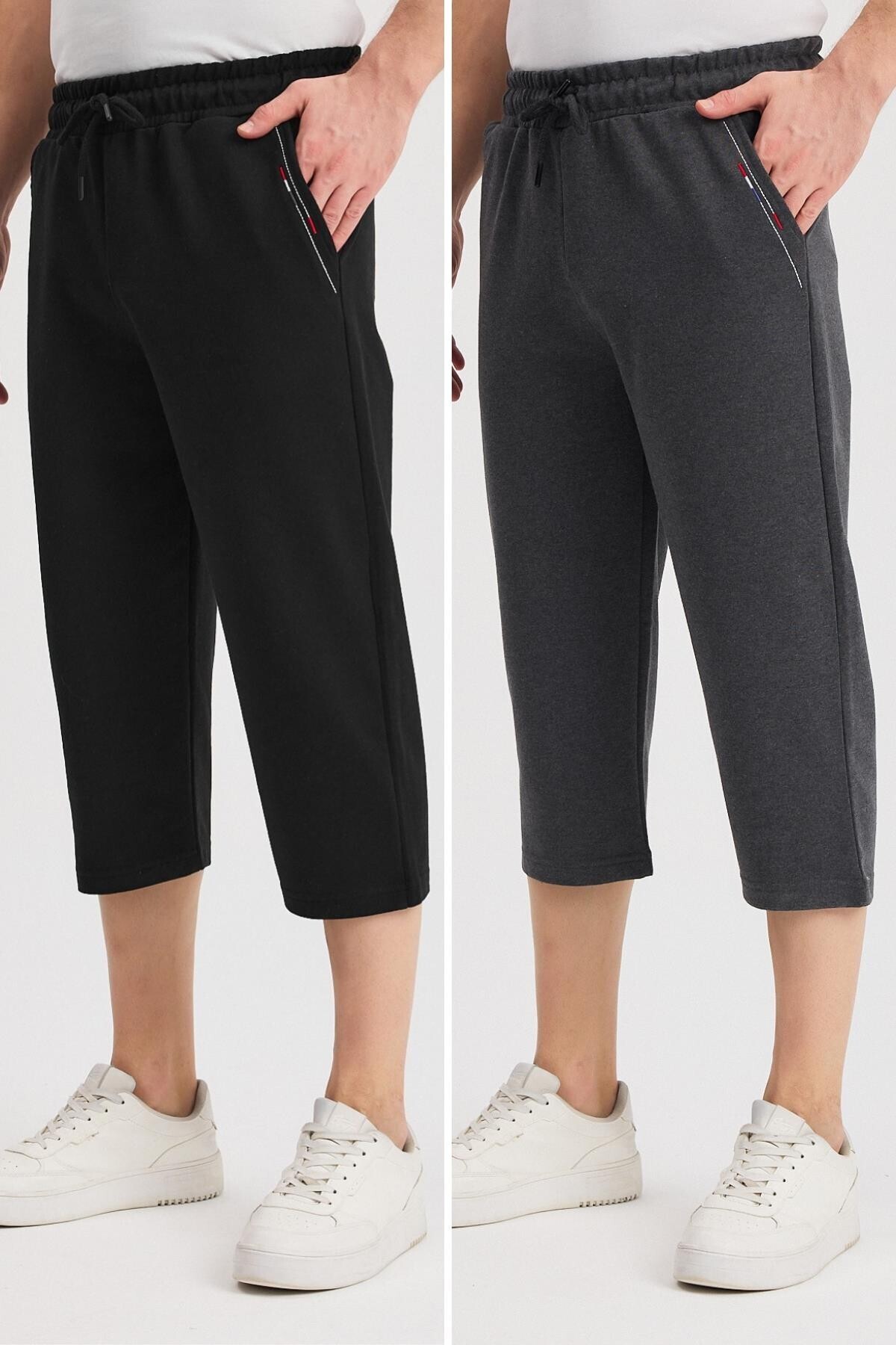 شورت رجالي طويل بجيوب باللون الأسود-أنثراسايت برمودا بطول تحت الركبة مع خصر كابري قابل للتعديل ومطاط