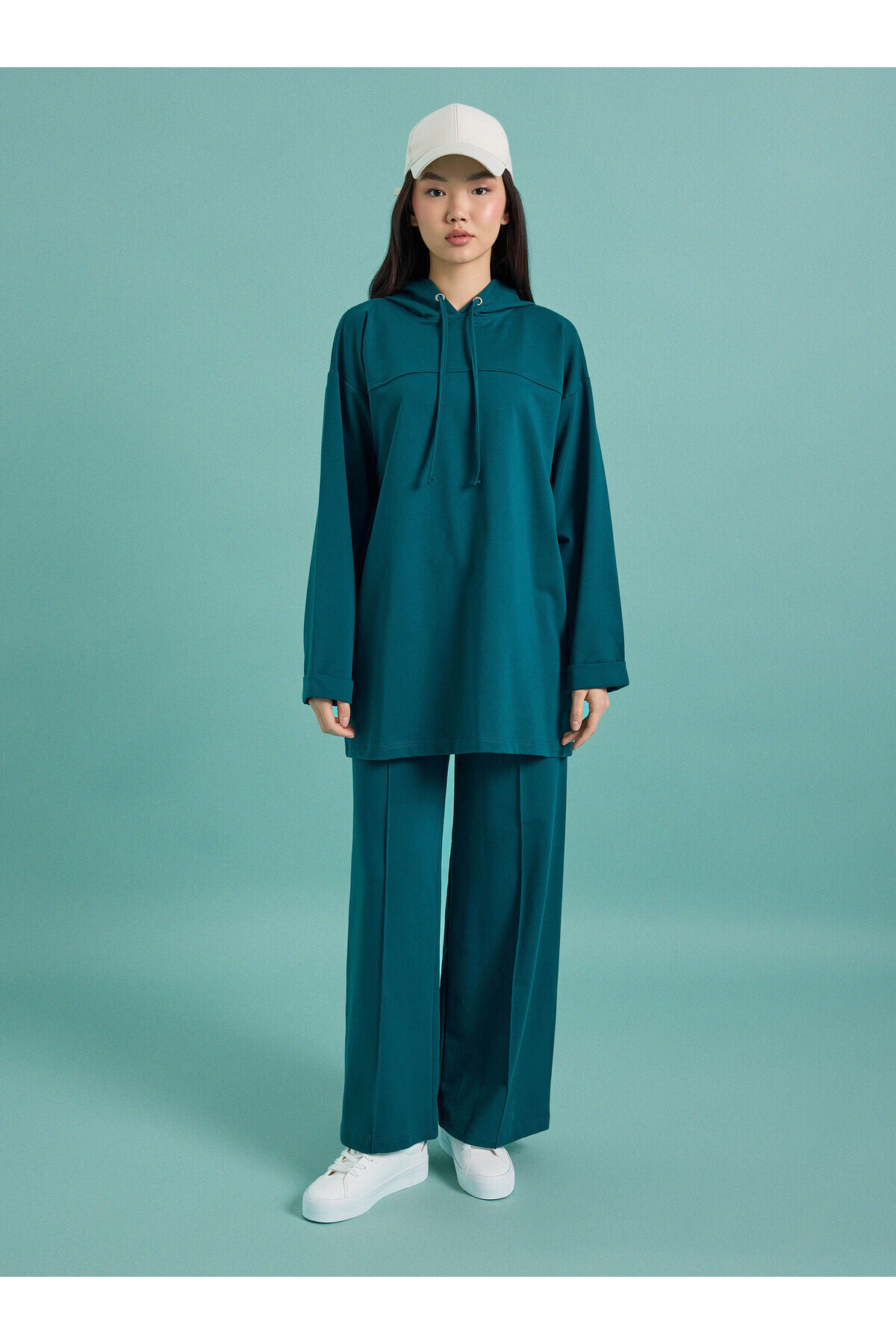 طقم بدلة رياضية بقلنسوة وتفاصيل خياطة - زمرد داكن -