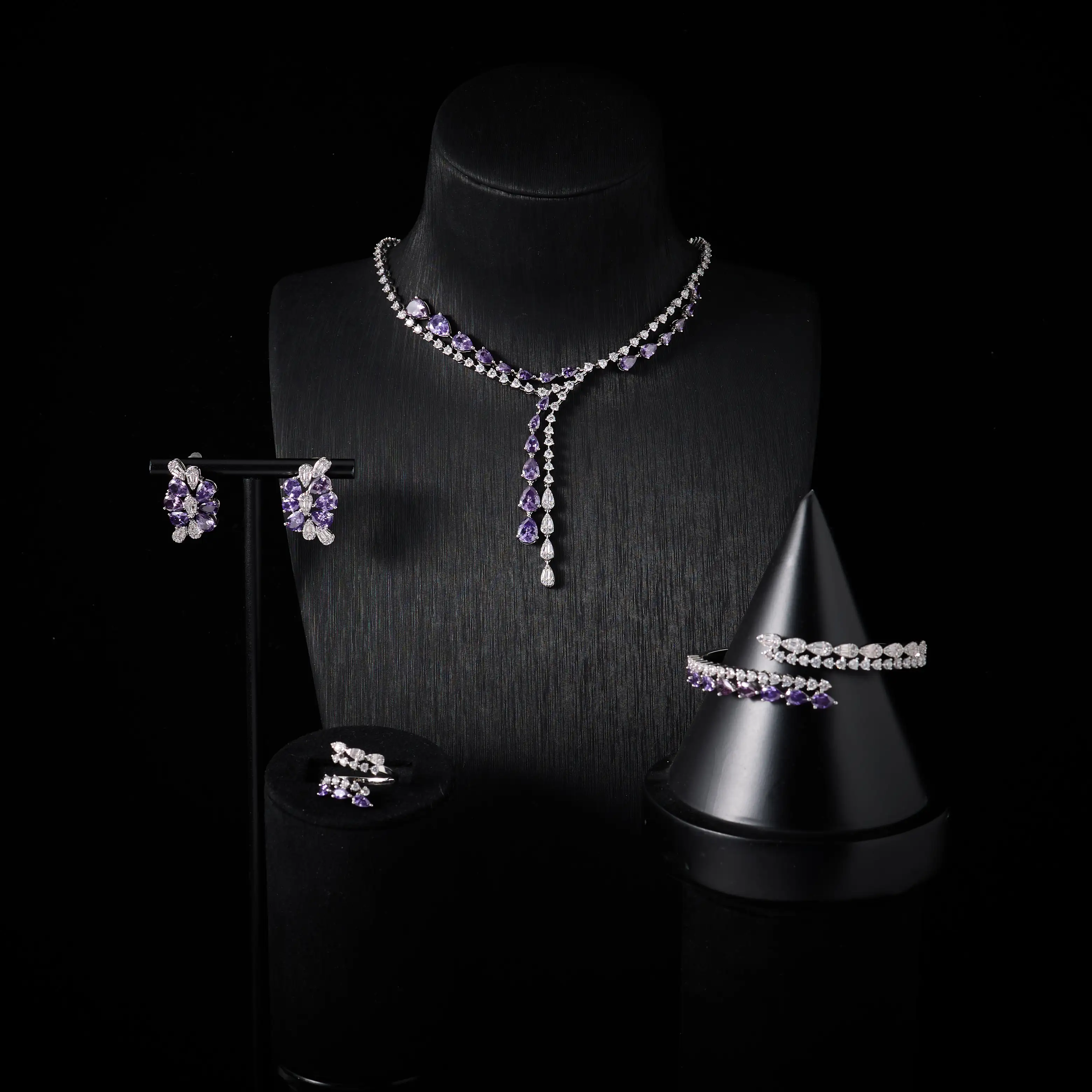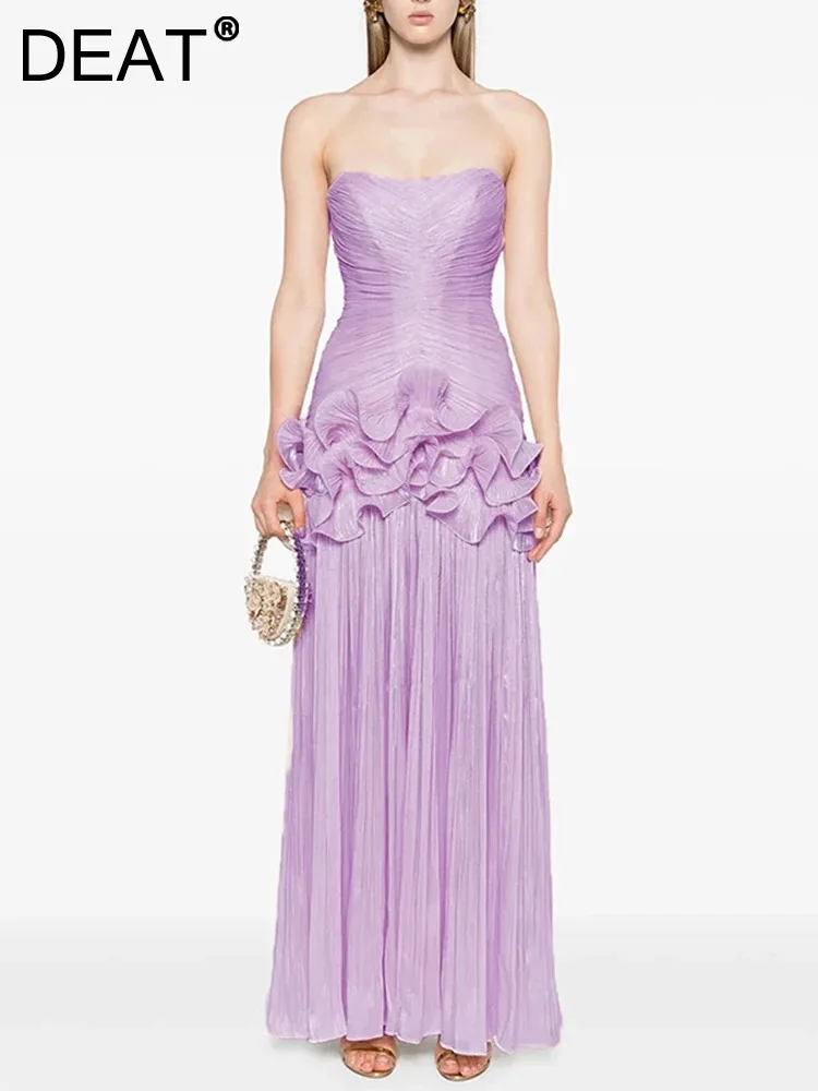 فستان ليلكي طويل بتصميم مكشوف الأكتاف وثنيات ناعمة