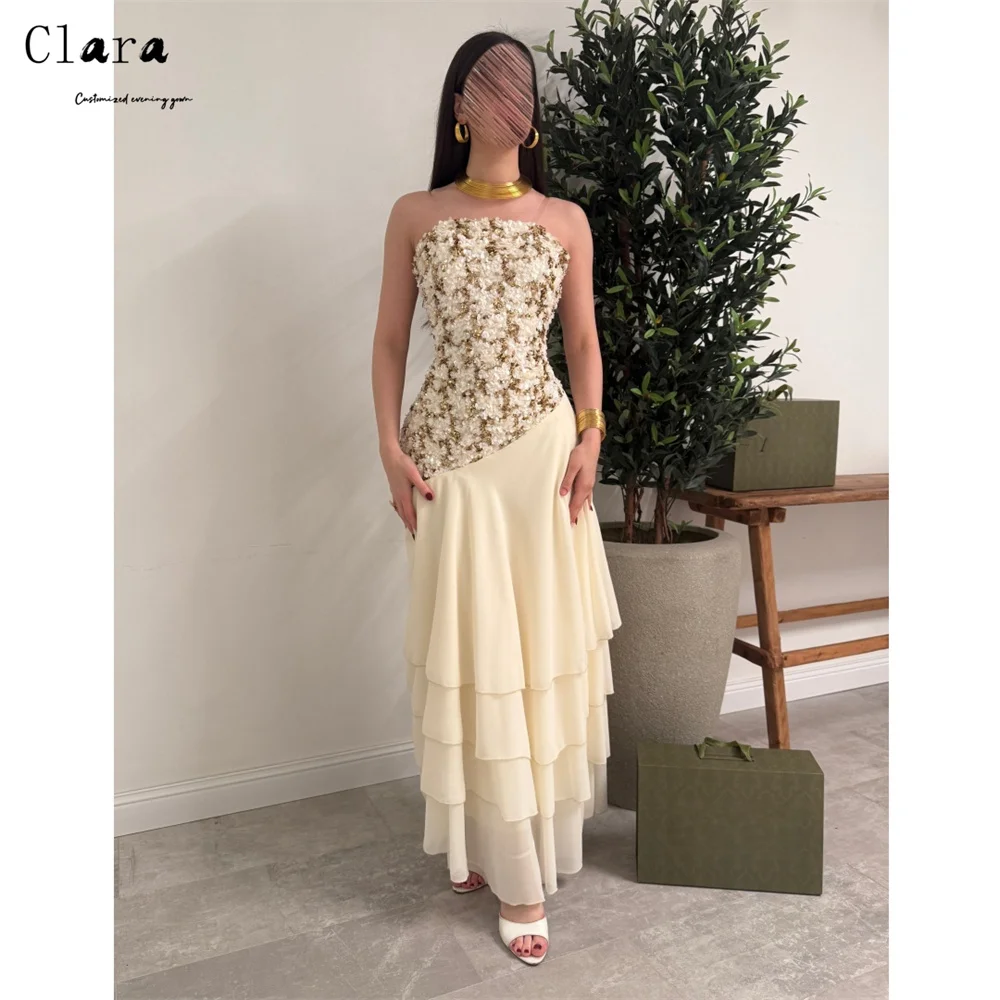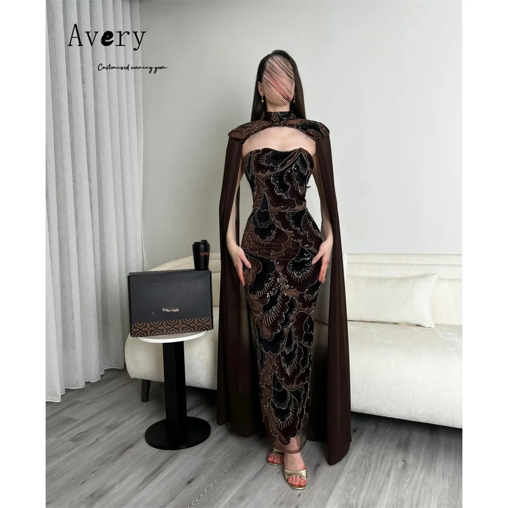 فستان بني أنيق بتصميم أوف شولدر وذيل انسيابي