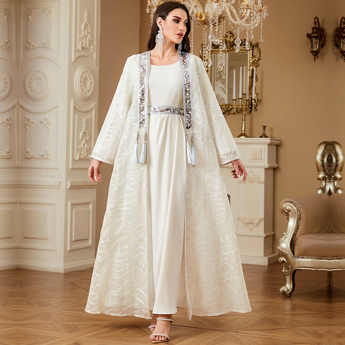 جلابية أوف وايت طويلة بتطريز ذهبي وحزام أنيق