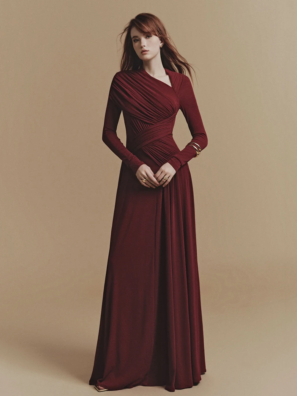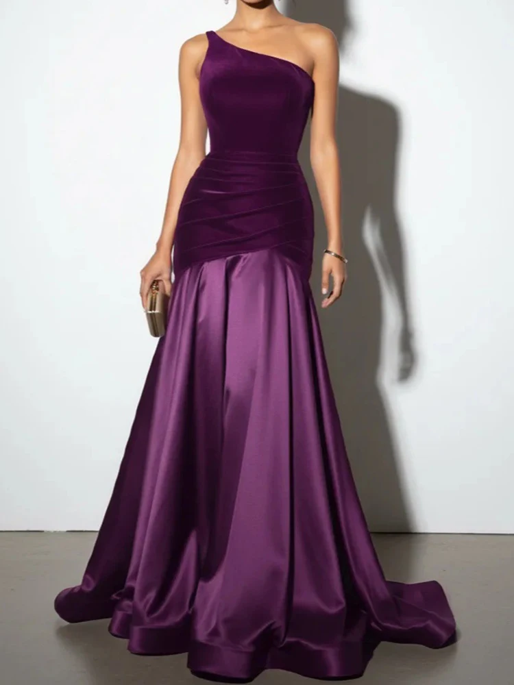 فستان زيتي بتصميم كتف واحد وثنيات أنيقة