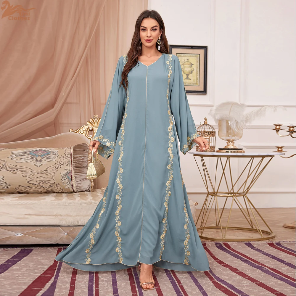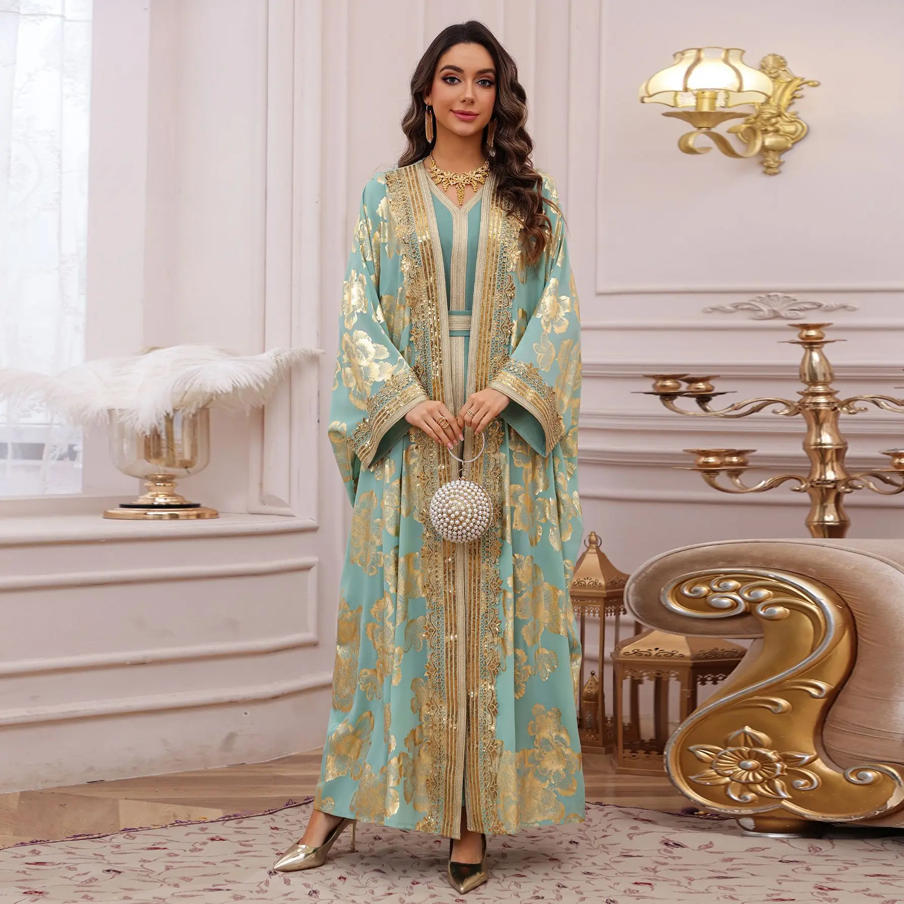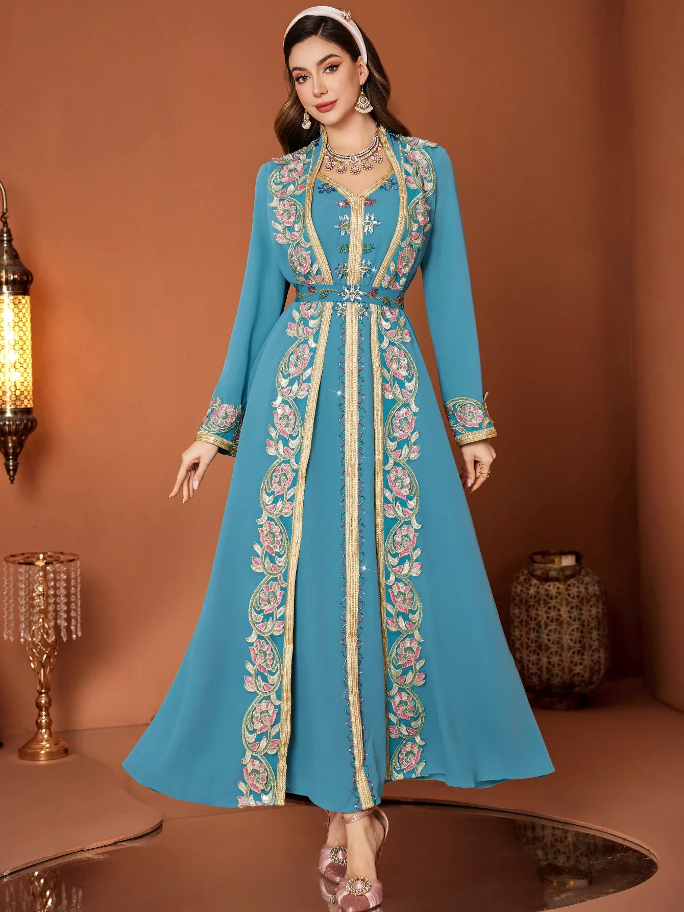 جلابية تركواز طويلة بتطريز ذهبي فاخر