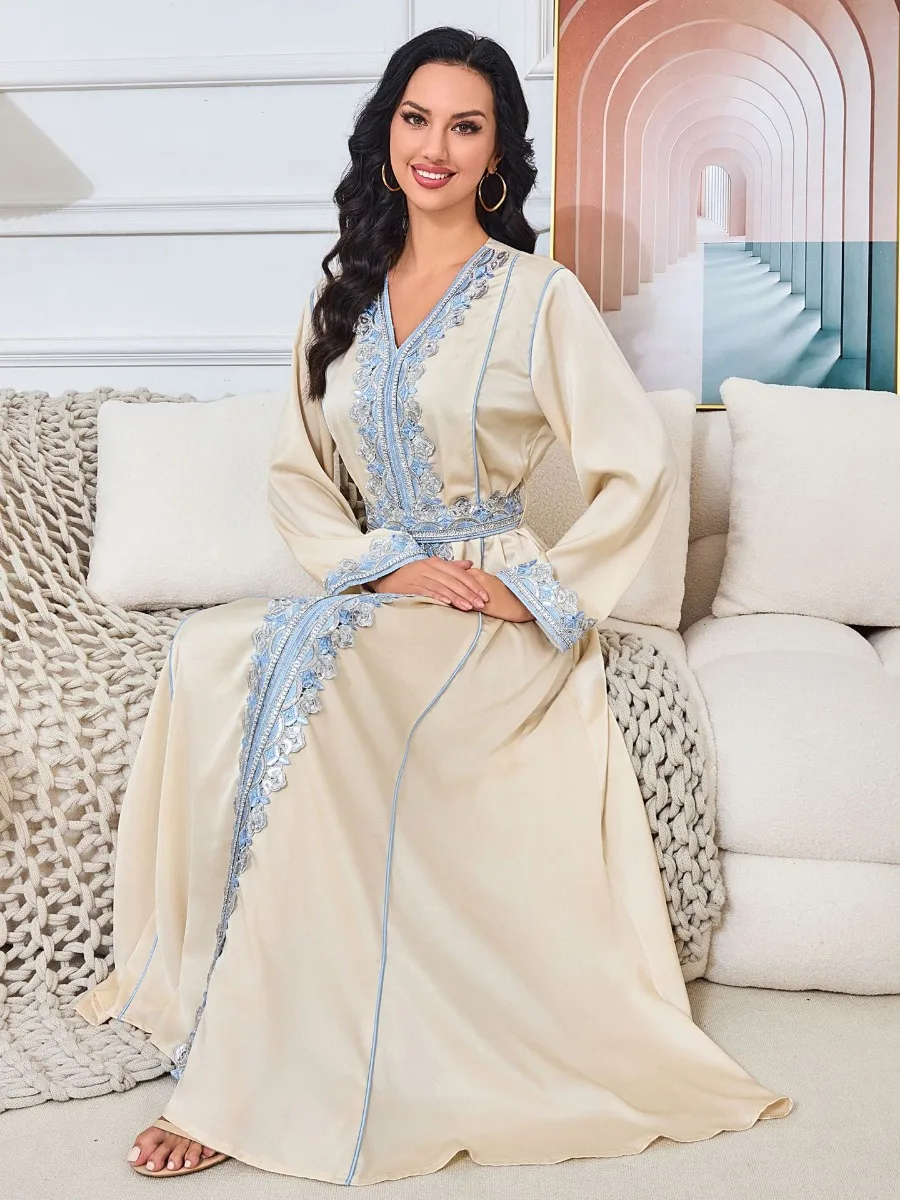 جلابية بيج بتفاصيل دانتيل أزرق وحزام