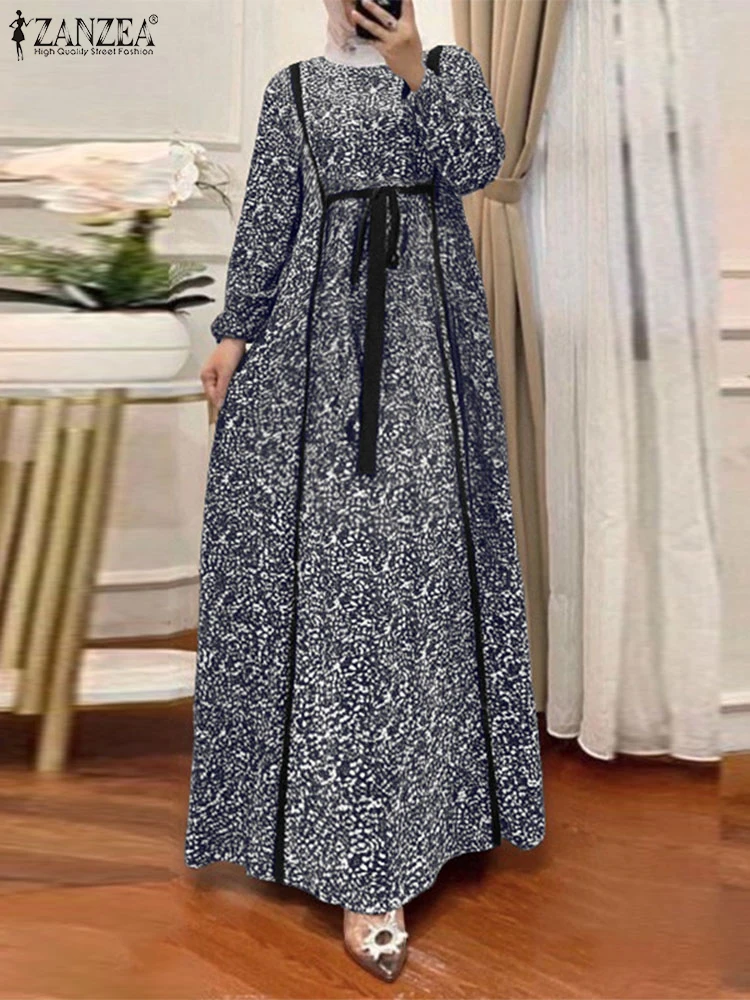 فستان طويل بنقشة ناعمة وربطة خصر – ستايل أنيق يومي