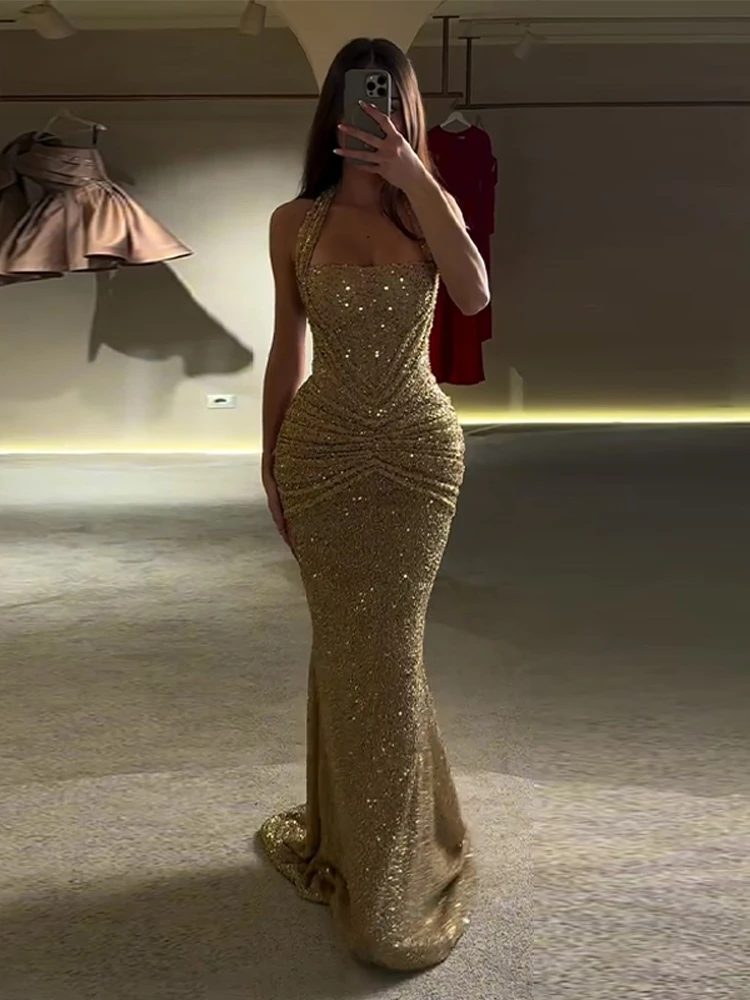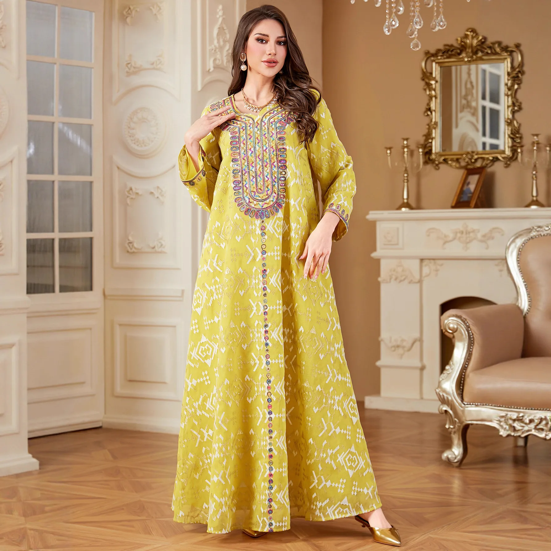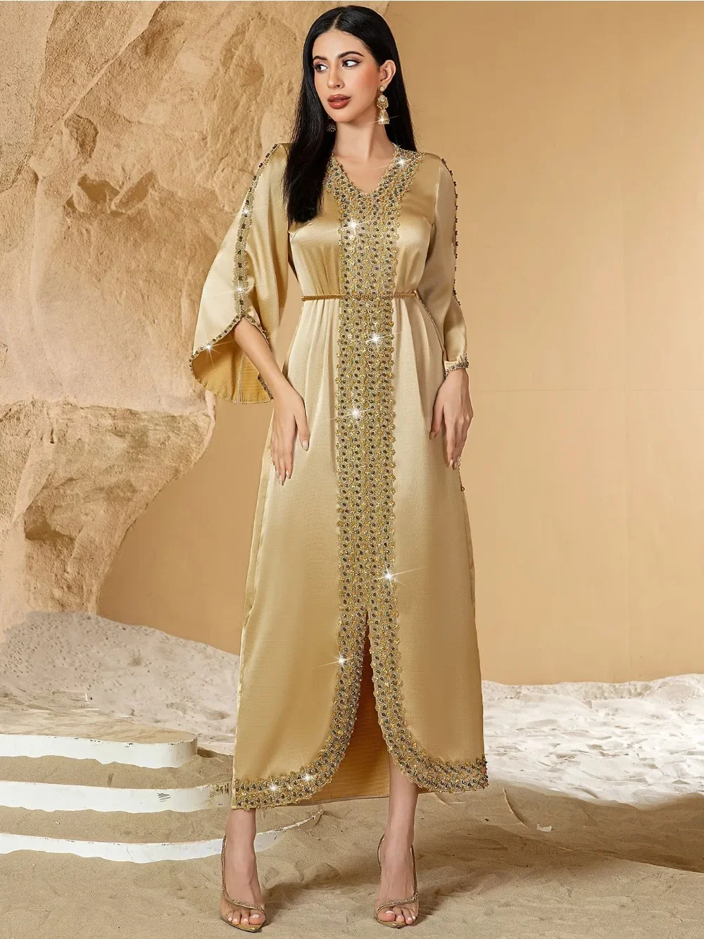 جلابية ذهبي طويلة بتطريز فاخر وأكمام واسعة