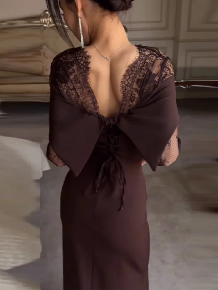 فستان بني طويل بتفاصيل دانتيل وظهر مفتوح
