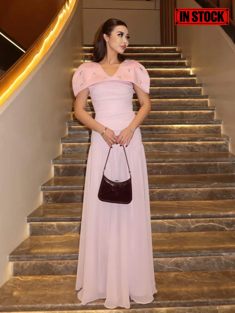 فستان وردي بتصميم كلاسيكي مع كاب أنيق