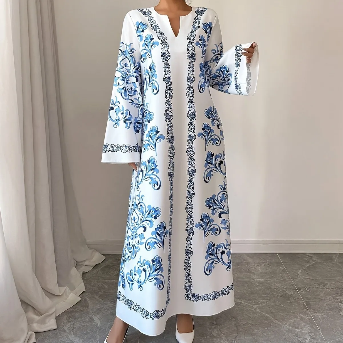 جلابية بيضاء طويلة بنقوش زرقاء وأكمام واسعة