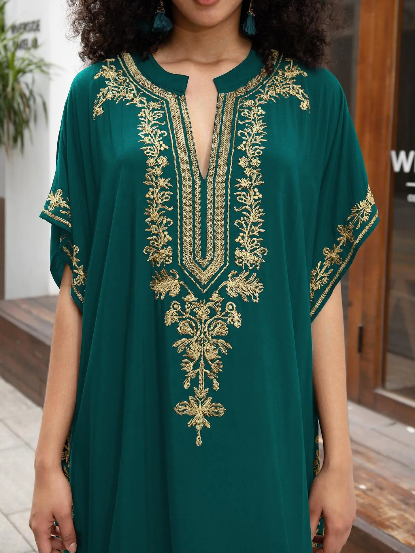 جلابية أخضر فستقي بتطريز ملون تراثي
