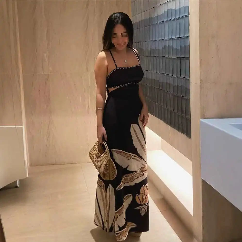 فستان أسود ميدي لامع بأكتاف مكشوفة