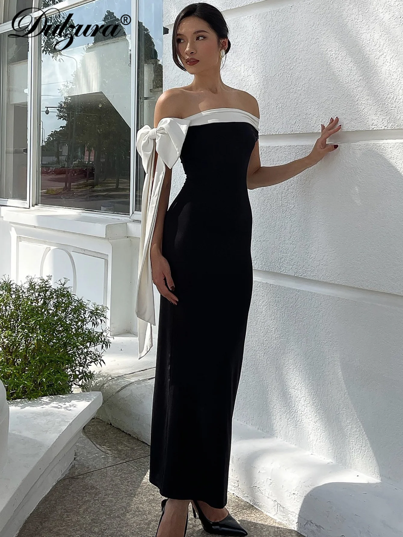 فستان دولزورا طويل بدون أكتاف بدون أكمام مع فيونكة للنساء، فستان طويل أنيق مثير للحفلات والنوادي والمكتب، ملابس شتوية
