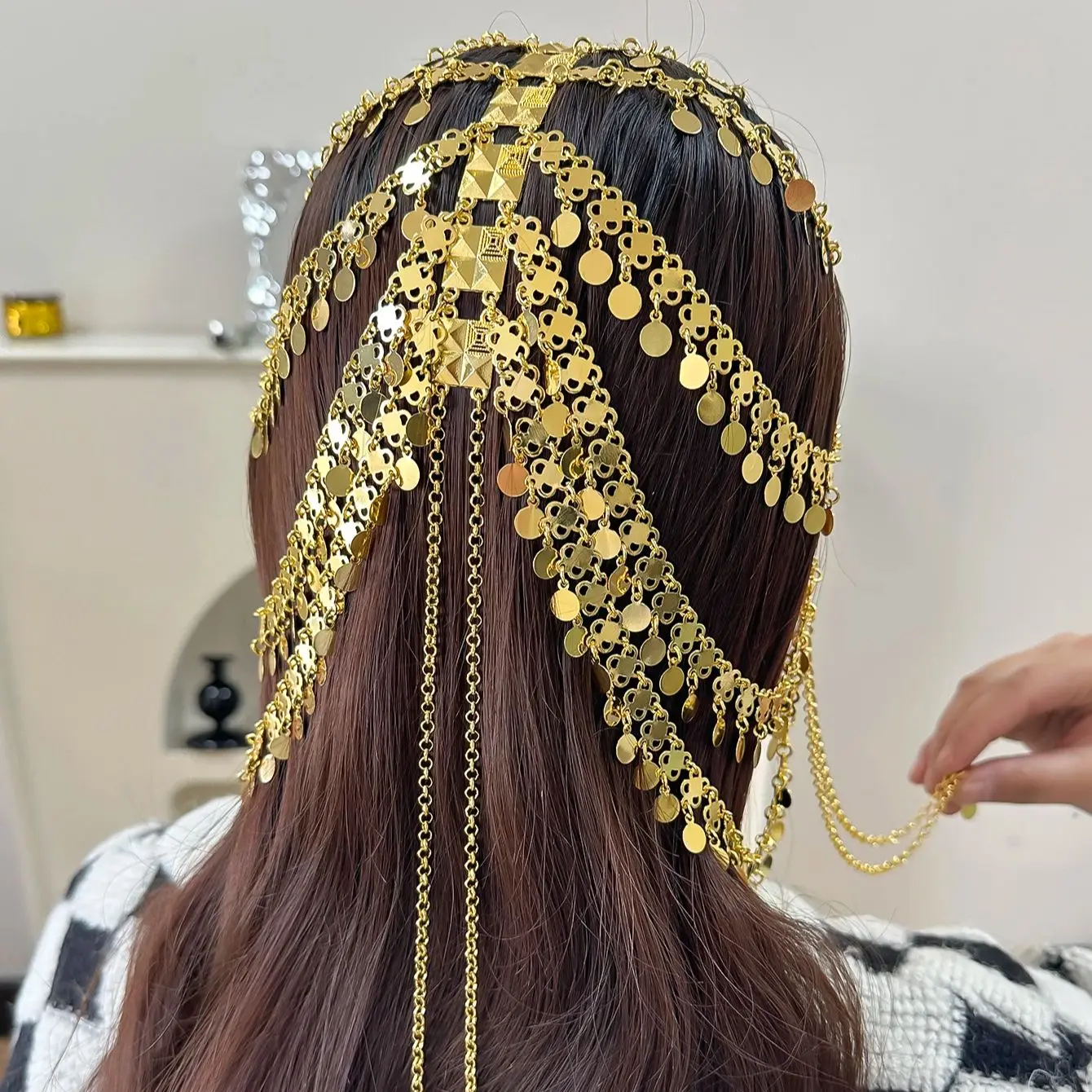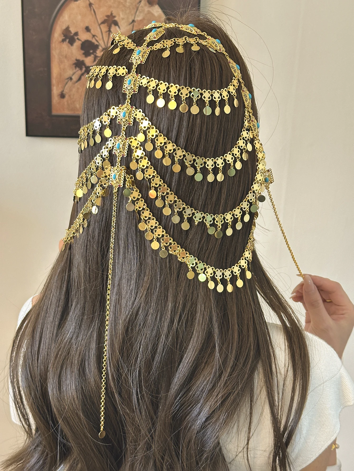 غطاء شعر ذهبي بعملات متدلية ولمسات فيروزية