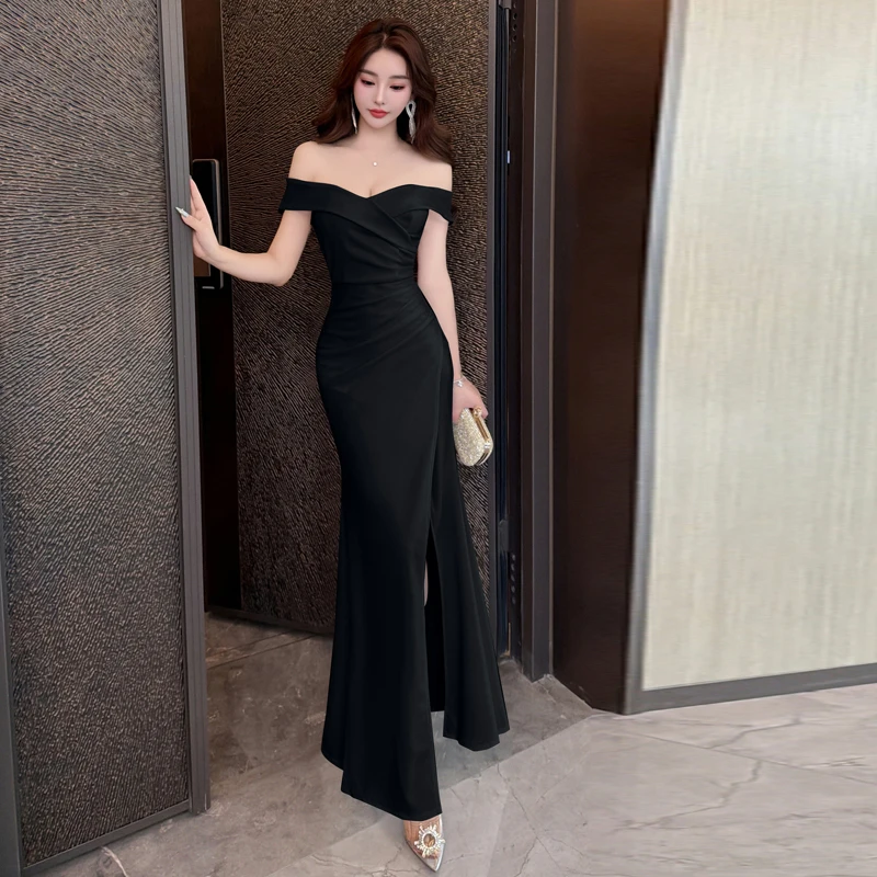 فستان أسود أوف شولدر بقصة أنثوية فاخرة