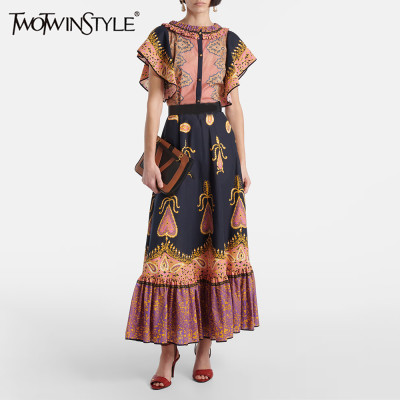 TWOTWINSTYLE Colorblock فضفاض تقسم الدانتيل يصل فساتين الموضة للنساء الجولة الرقبة بلا أكمام المرقعة فستان مطبوع الإناث