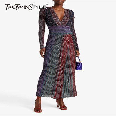 Twotwinstyle فستان مخطط للنساء كم طويل الخامس الرقبة عالية الخصر نمط الأزياء خمر نمط