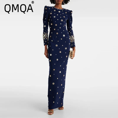 QMQA أزياء المرأة مأدبة فساتين ماكسي مسمار حبة الماس تقسم سليم صالح كم طويل عالية الخصر فستان رسمي الملابس 1A781