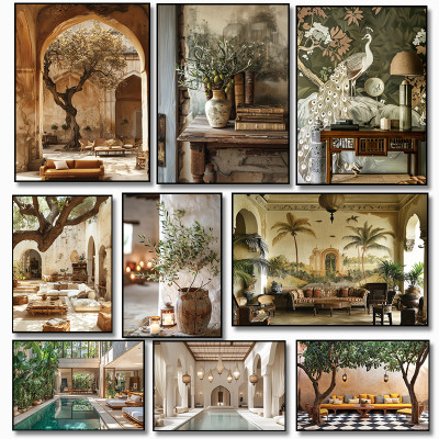 منظر طبيعي خشبي عتيق ، ملصق بني ، شجرة غابة داكنة ، طباعة على القماش ، رسم جداري ، صورة مزرعة ، ديكور منزلي