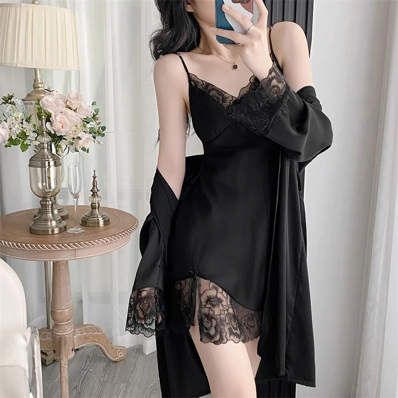 Twinset طقم حمام نسائي من الدانتيل وثوب نوم كيمونو صيفي من الساتان الحريري