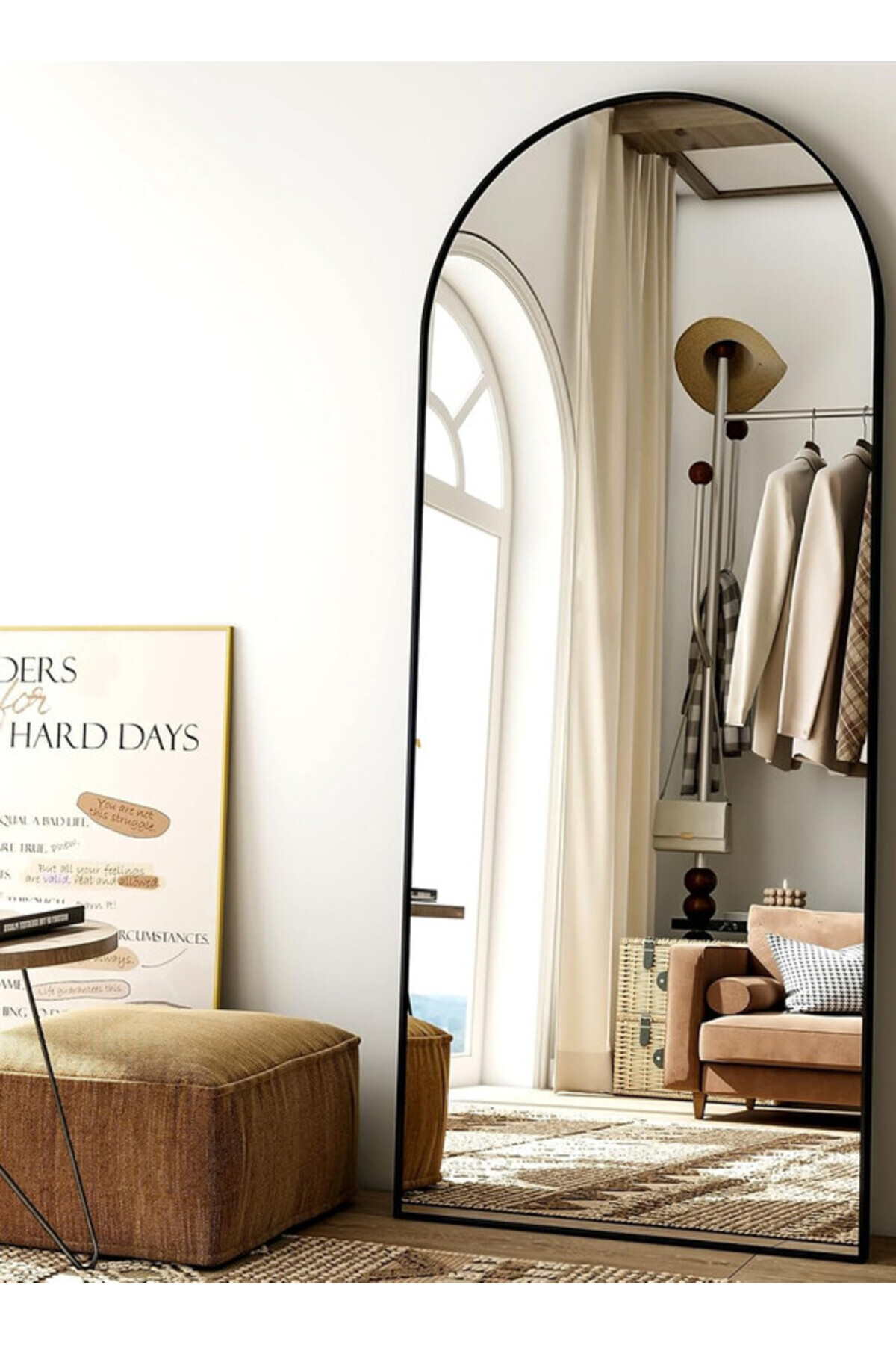 مرآة كبيرة بتصميم أنيق، مقاس 160×50 سم، بإطار معدني أسود وحامل خلفي