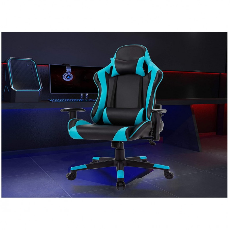 كرسي ألعاب فيديو جلد قابل للدوران مع مسند ودعم أسفل الظهر,أزرق-أسود