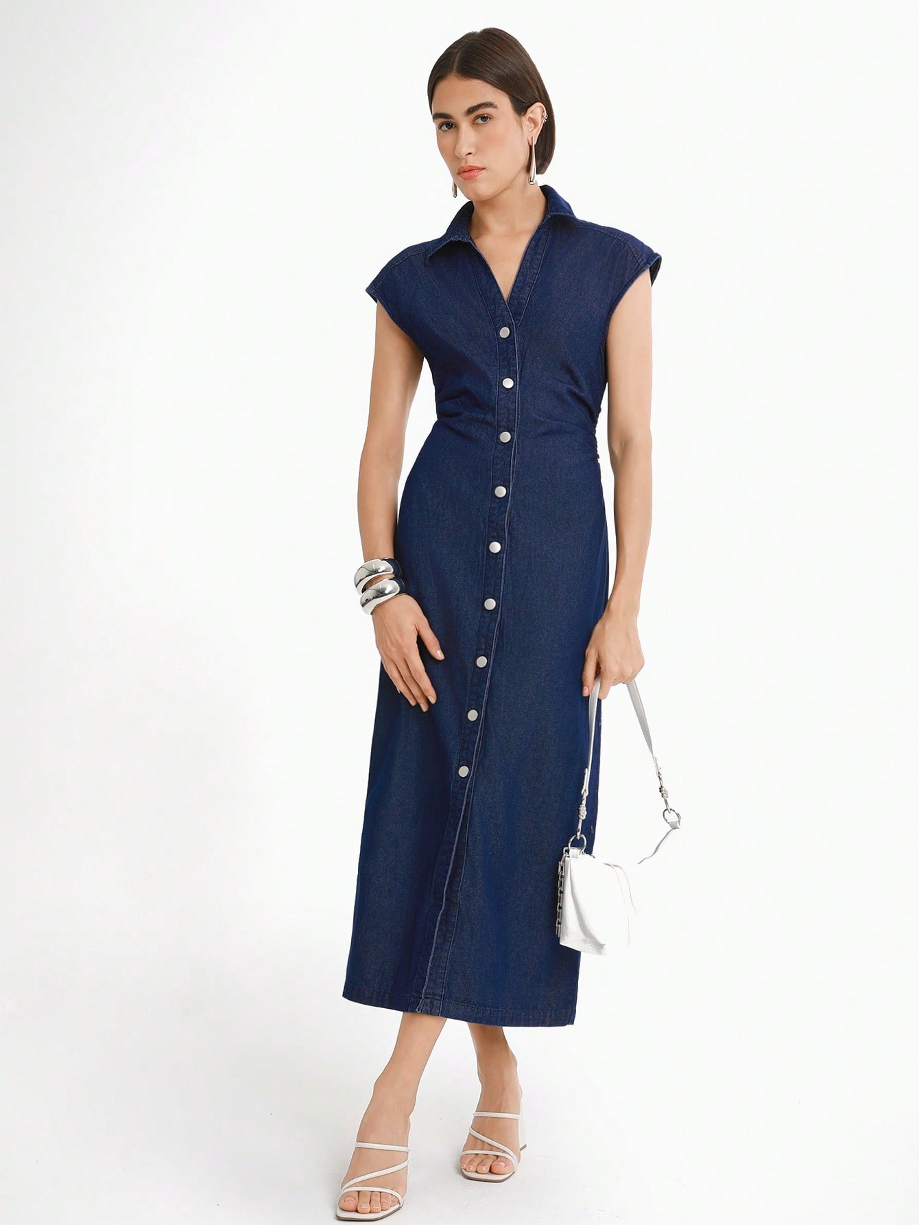 Daynim فستان جينز مستقيم بياقة مفرودة بدون أكمام للنساء