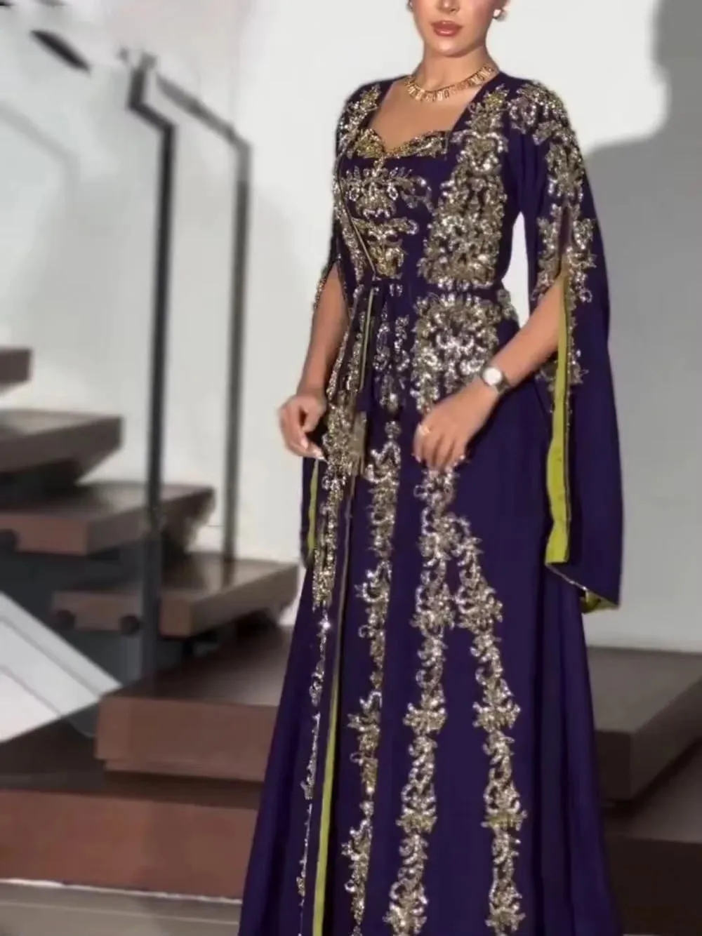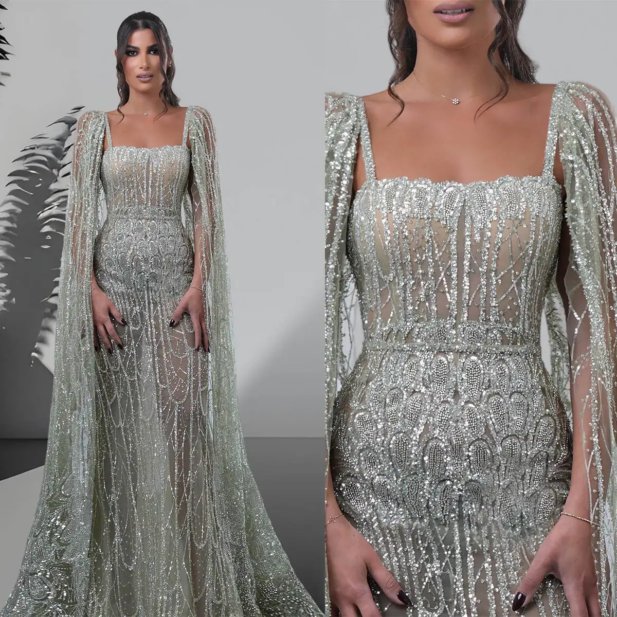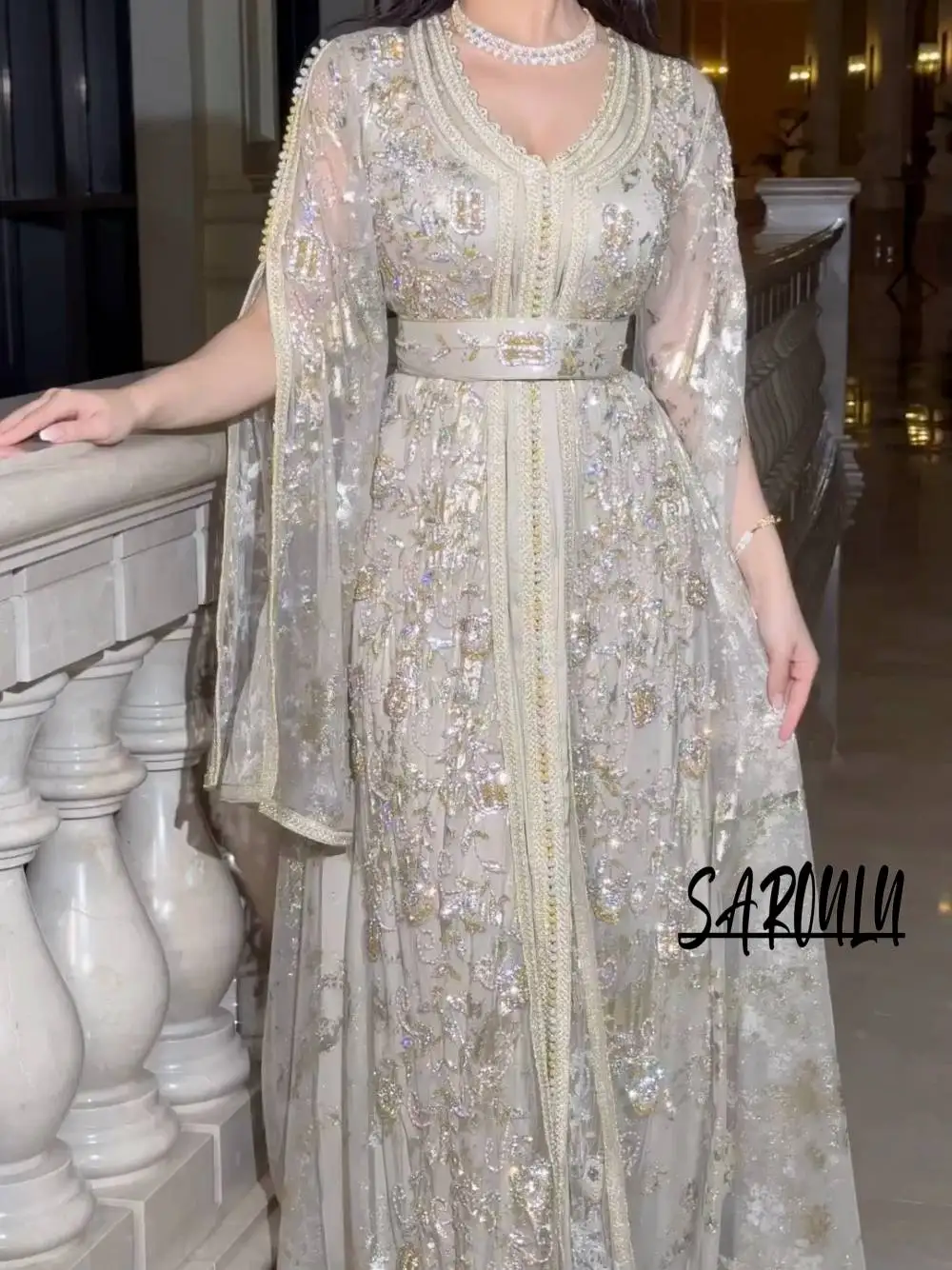 فستان سهرة بحورية البحر الجزائرية قفطان قفطان رقبة على شكل V ترتر فستان حفلات نسائي أنيق مزين مع كيب للحفل مخصص