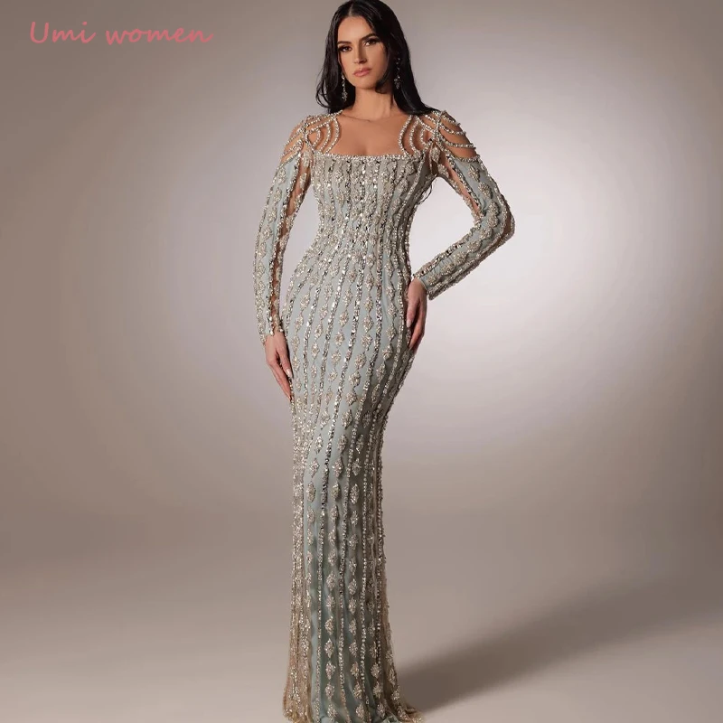 فستان سهرة بحورية البحر كريستال سباركلي برقبة مربعة وأكمام طويلة ترتر فساتين حفلات غمد طول الأرض حسب الطلب