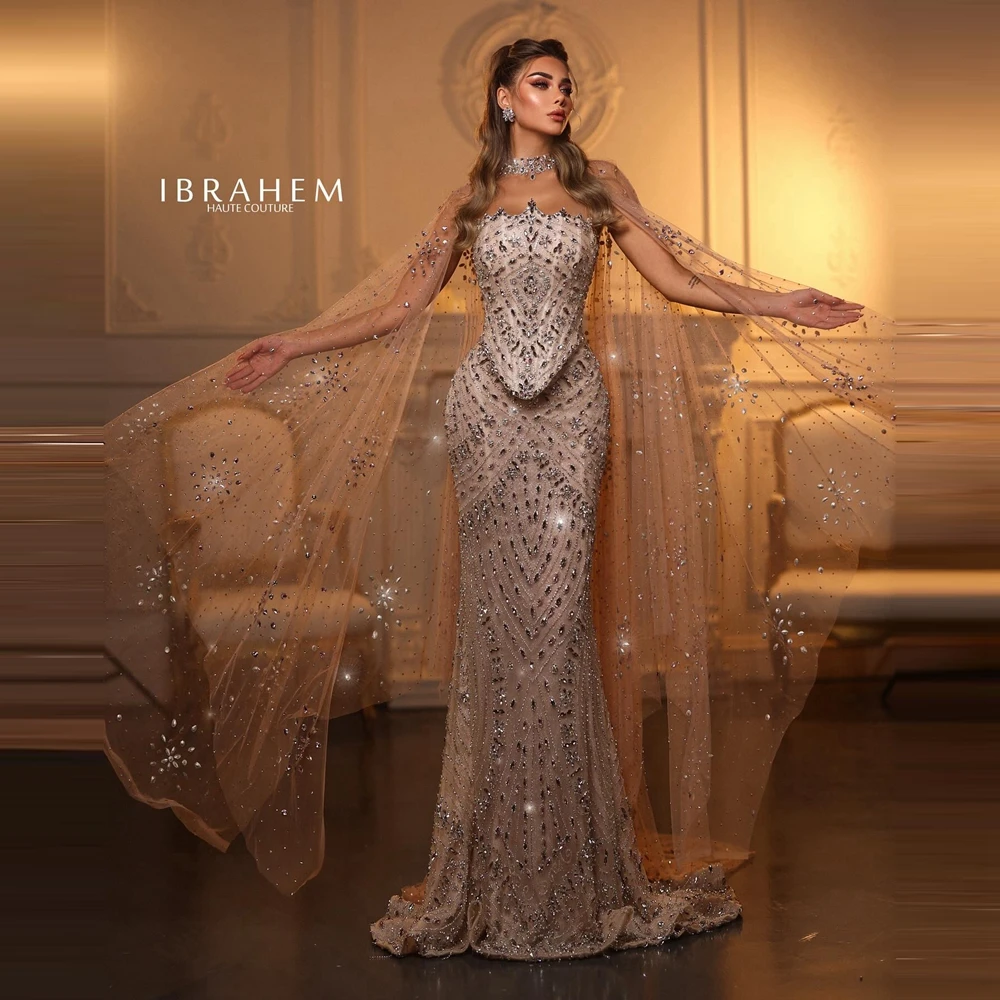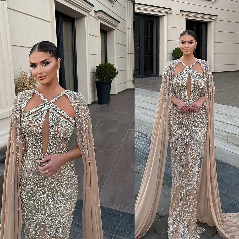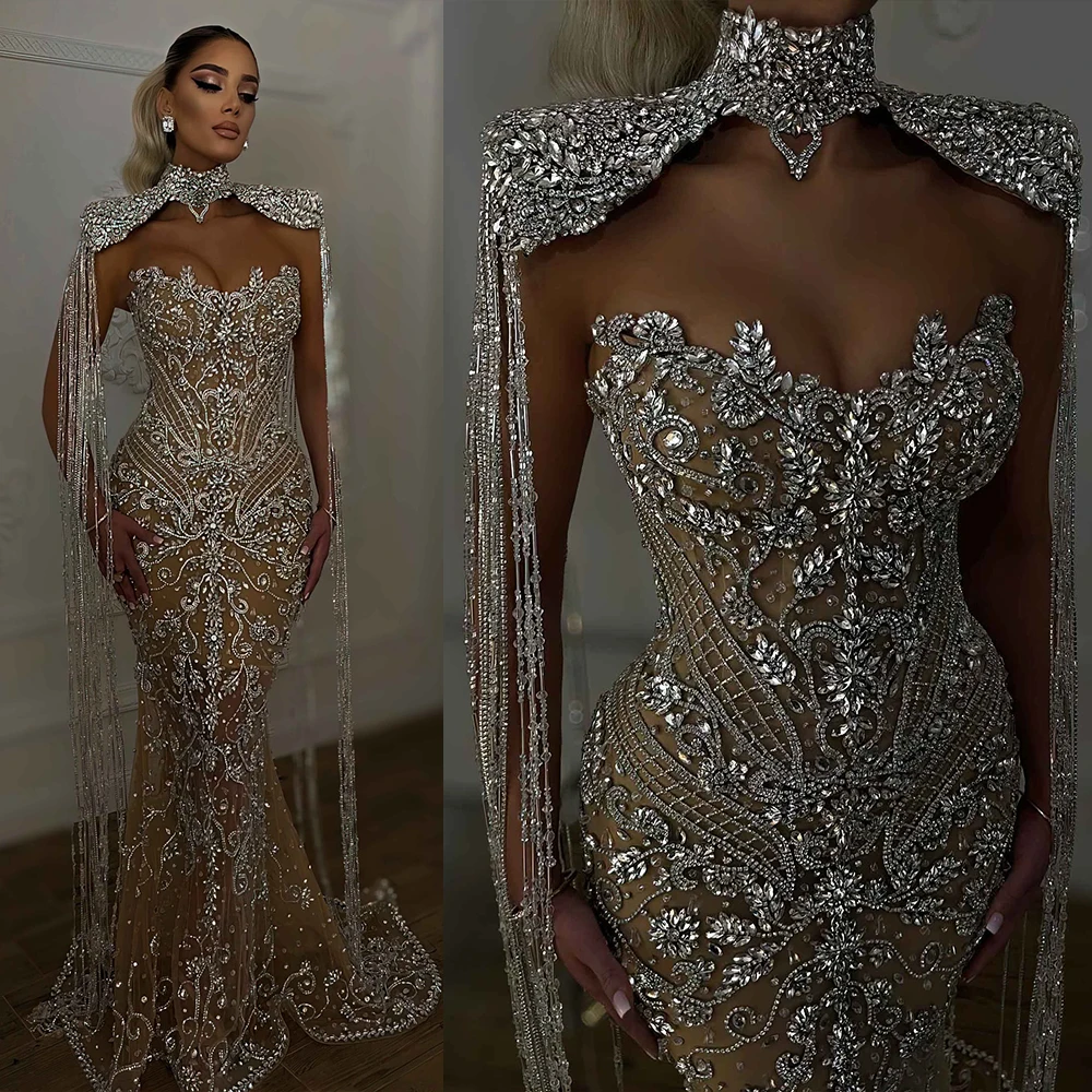 فساتين سهرة فاخرة بحورية البحر من المملكة العربية السعودية بأكمام كيب ورقبة عالية 2025 رداء حفلات دبي للنساء لحفلات الزفاف حسب الطلب