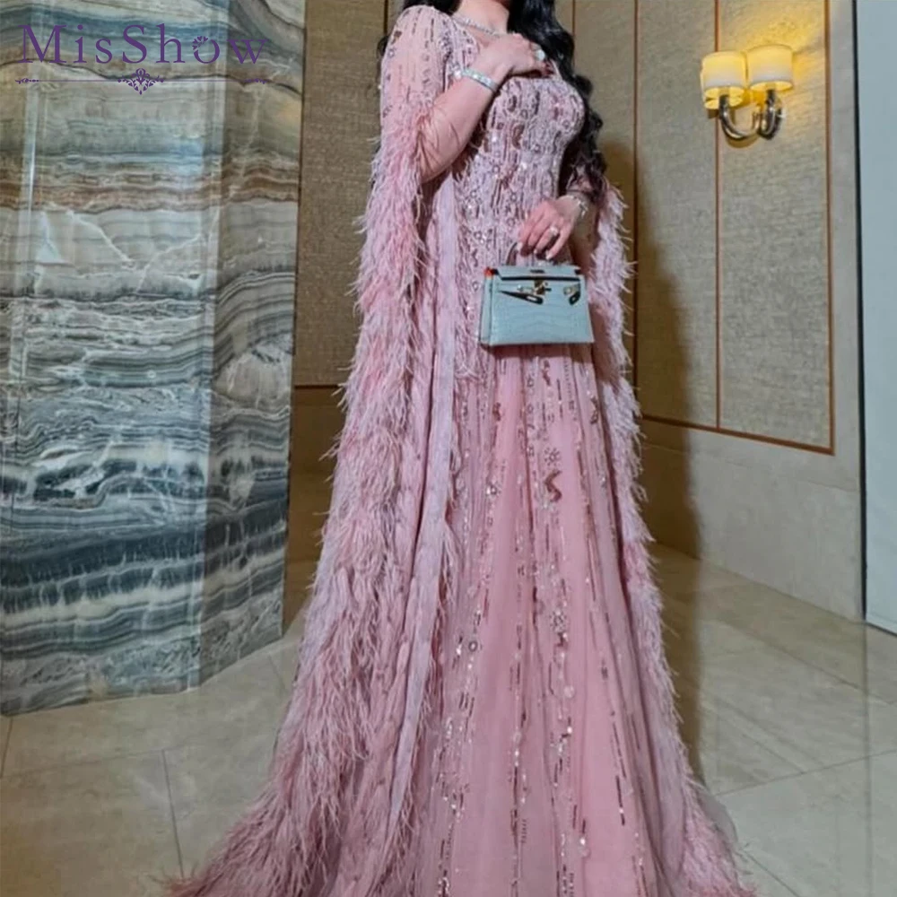 فستان سهرة من MisShow مخصص بالريش الوردي والخرز مع أكمام فساتين متواضعة لحفلات الزفاف العربية والولائم الملكية